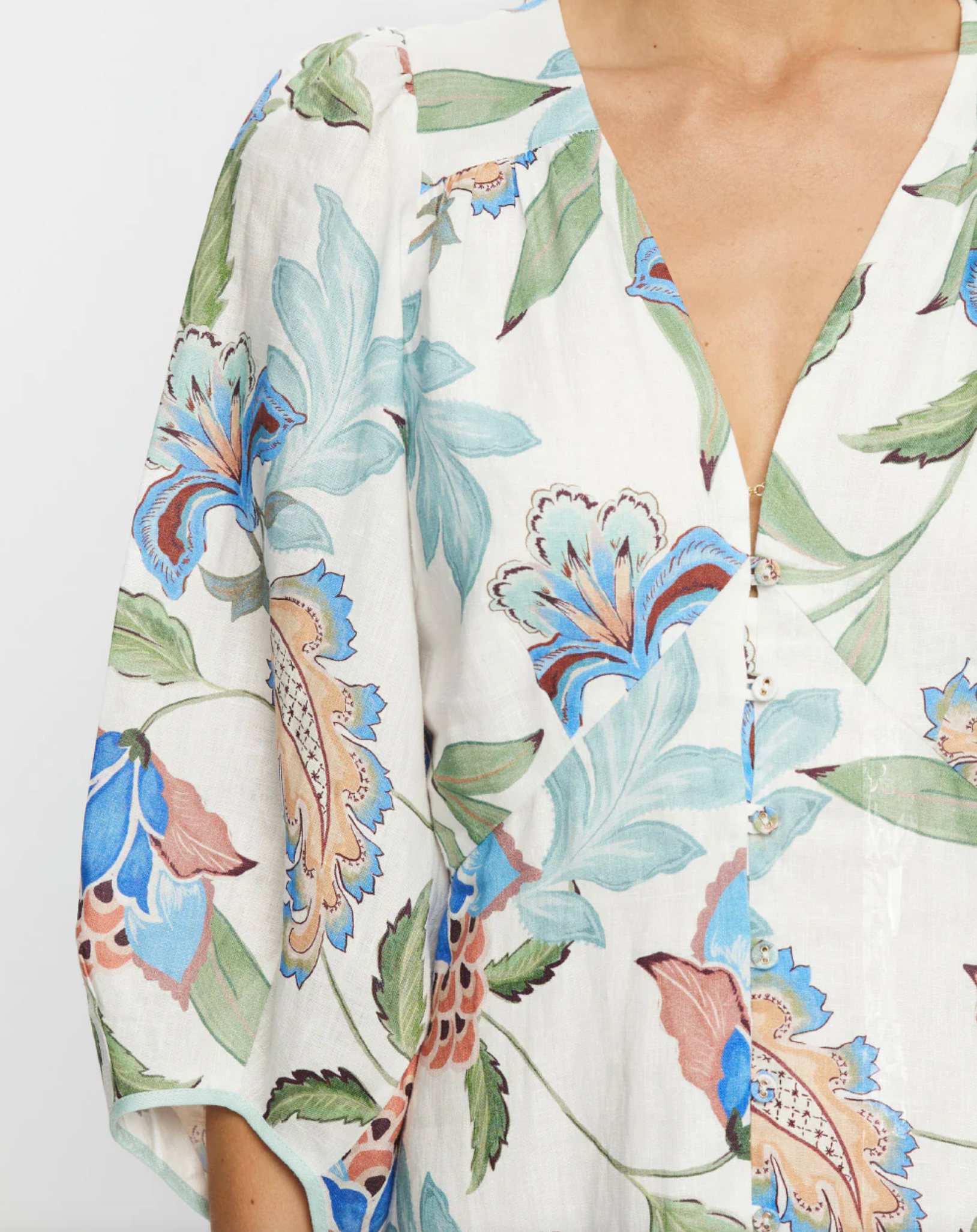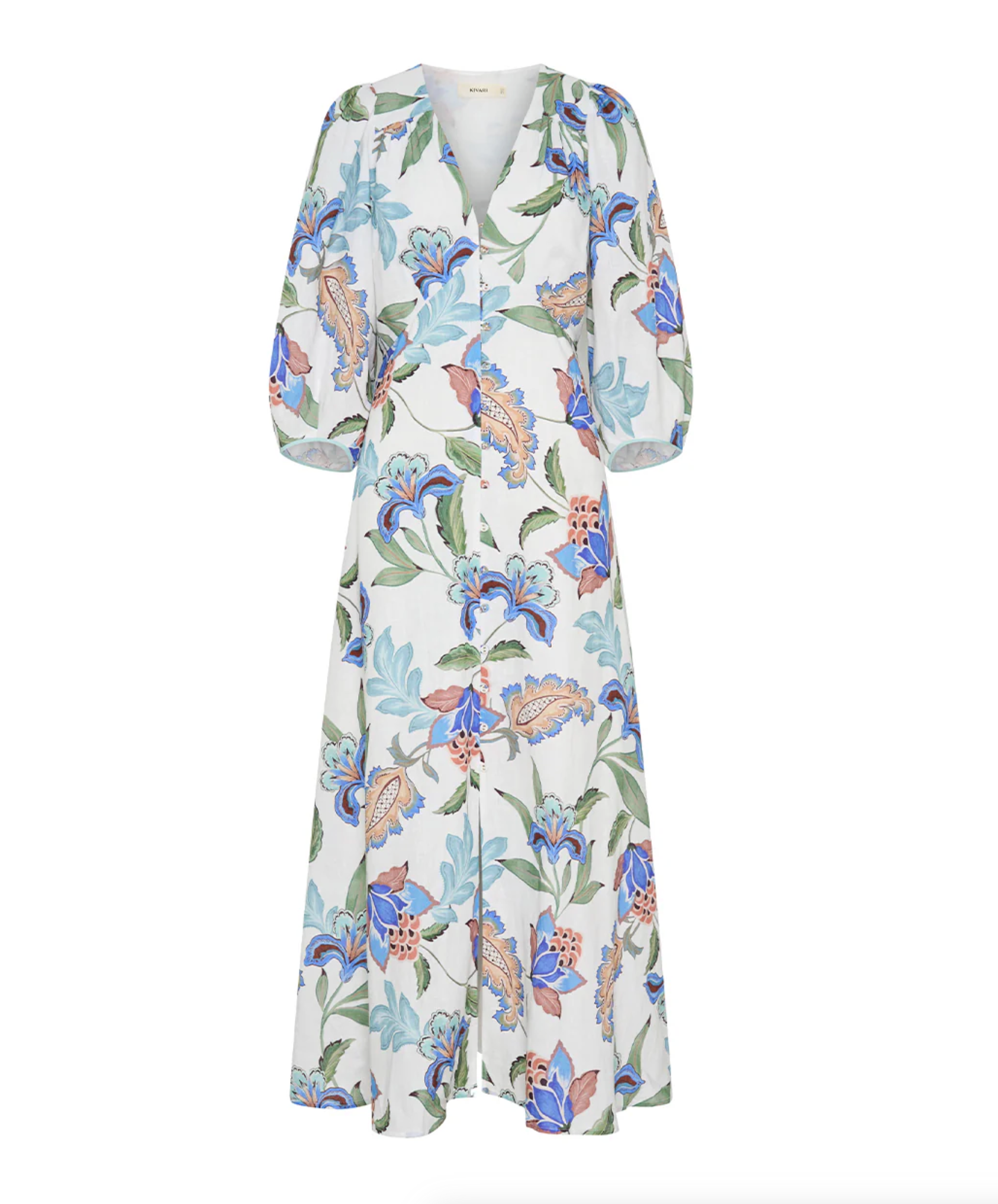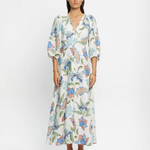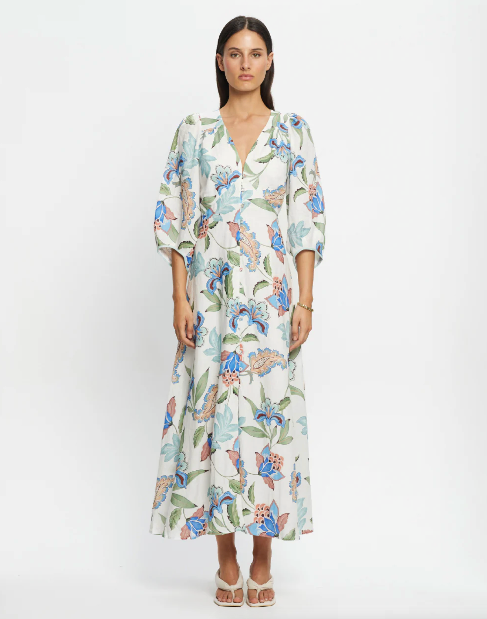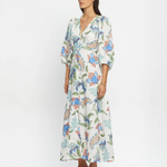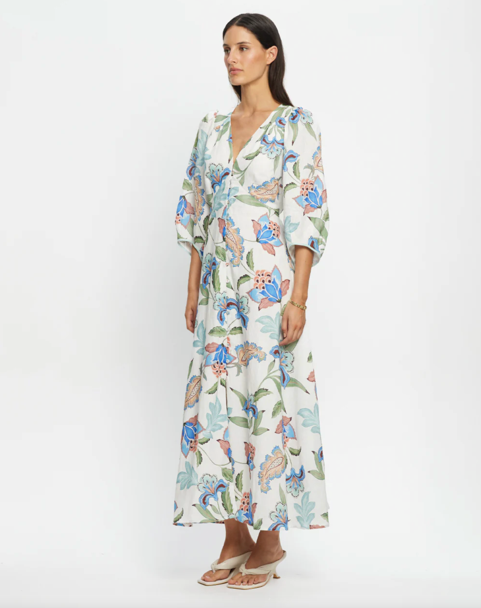 Azure is a bold floral, alive with striking blue blooms, terracotta accents and verdant green leaves on a crisp white base. The Azure Maxi Dress is defined by its feminine V-neckline, button-through front and softly flared hem. Long sleeves and contrast blue detailing complete the look, a timeless silhouette designed for both everyday ease and elevated moments.