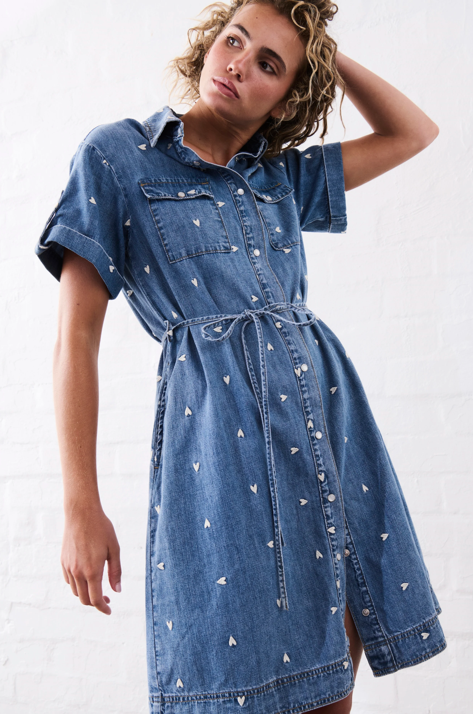 The Simone Dress is the easy mini shirtdress with a cool twist. Featuring patch utility pockets, buttons all down the front and an embroidered heart detail this is one-and-done kind of style that can be paired with sneakers for a cool, casual vibe.