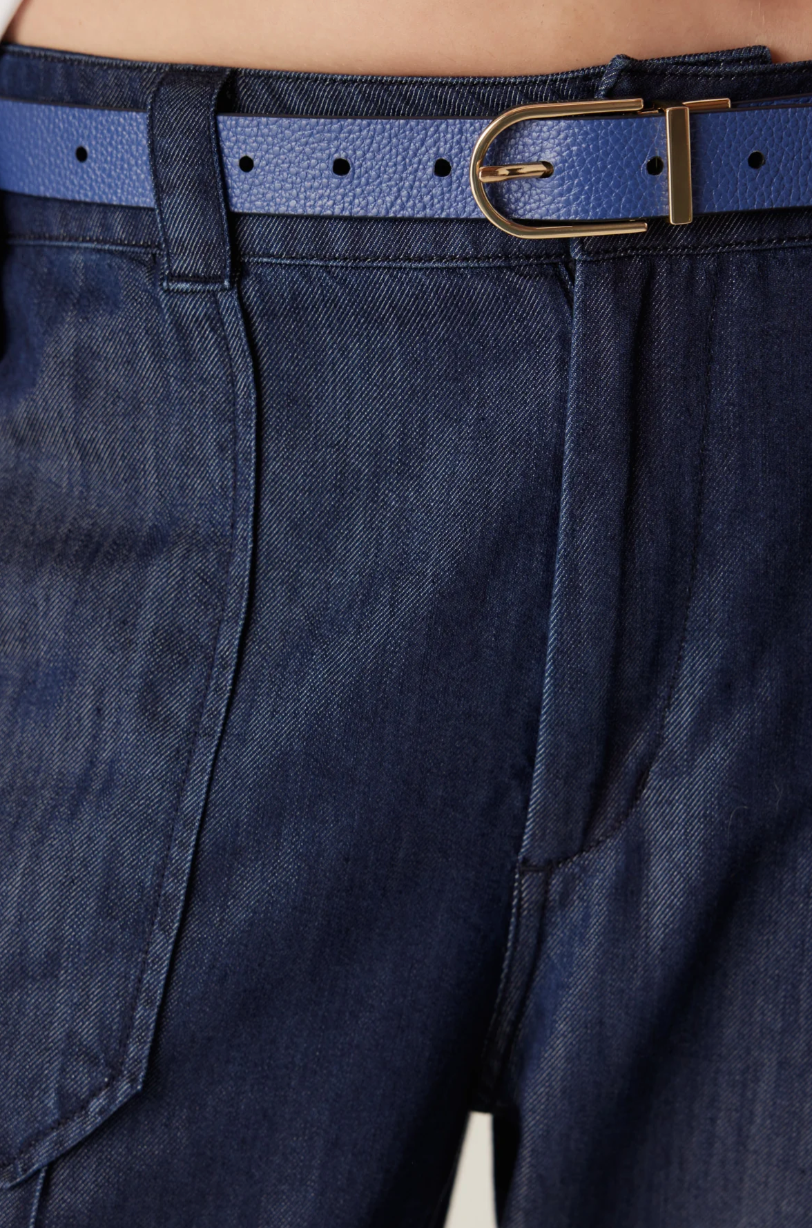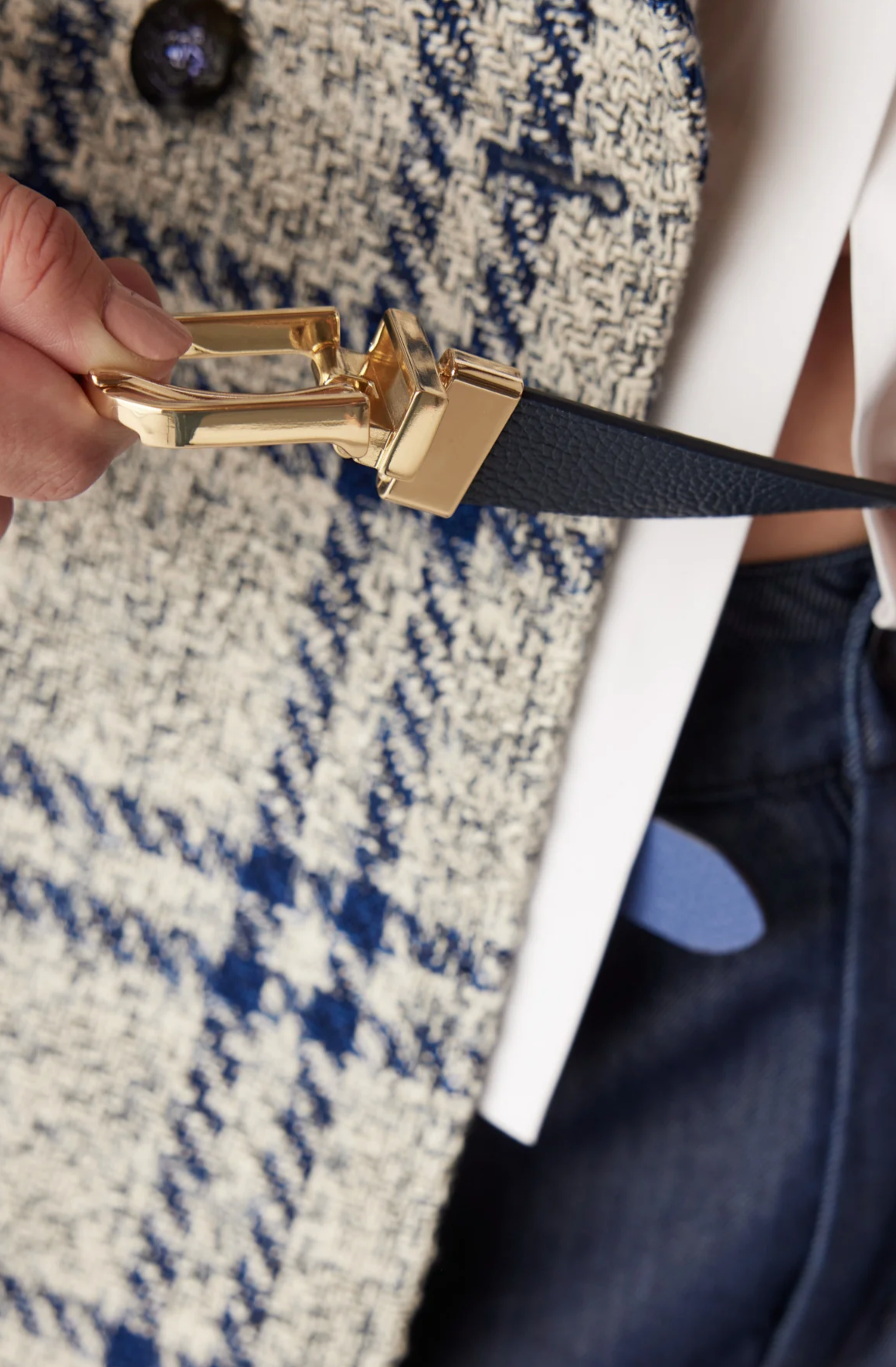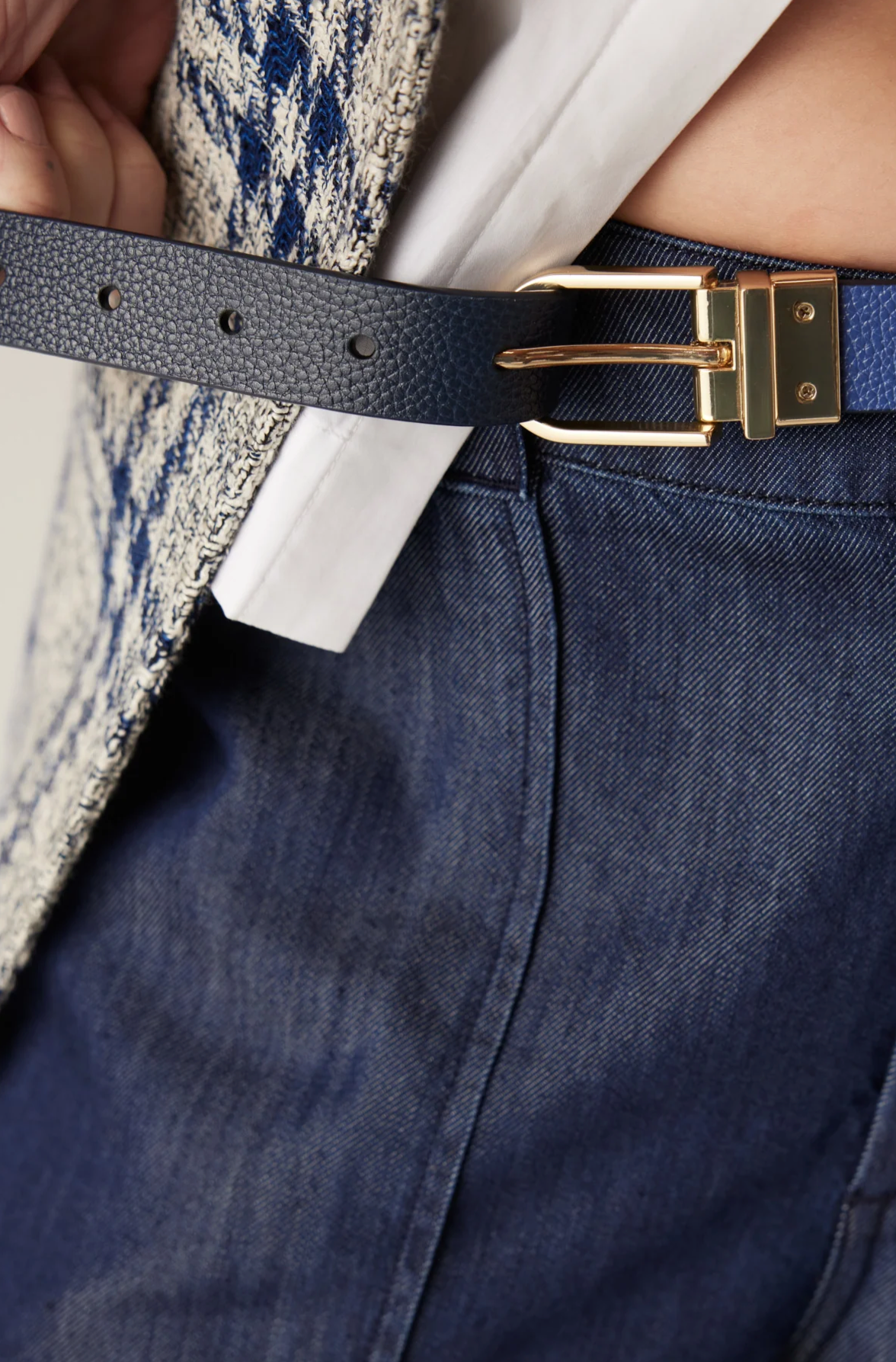 The Reversible Belt offers classic versatility with two colour options, navy & blue. Crafted from genuine leather, it features a slim 2.5 cm width and a gold hardware buckle.