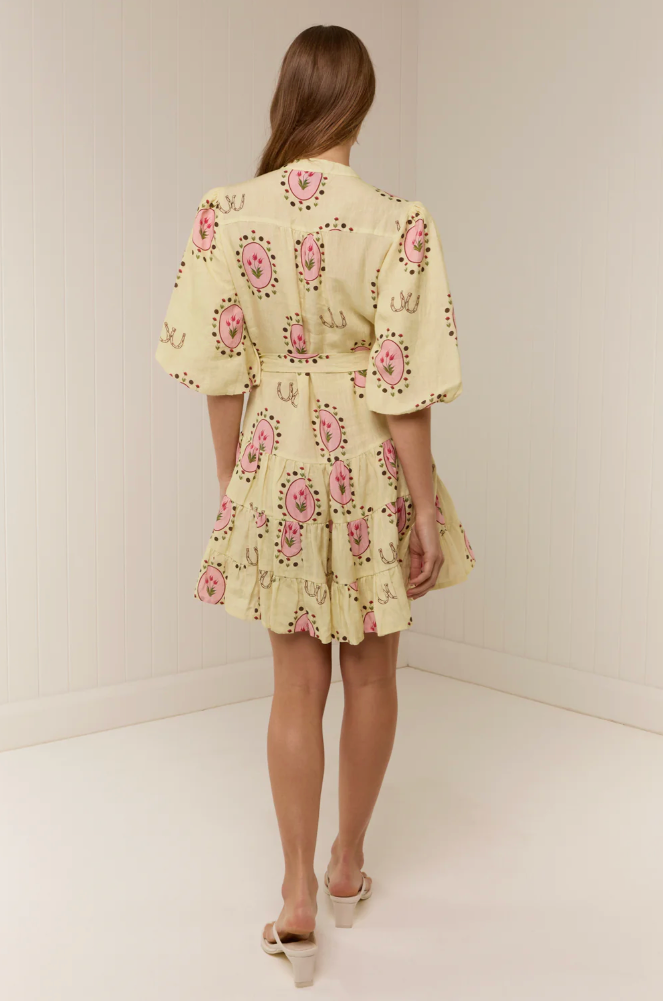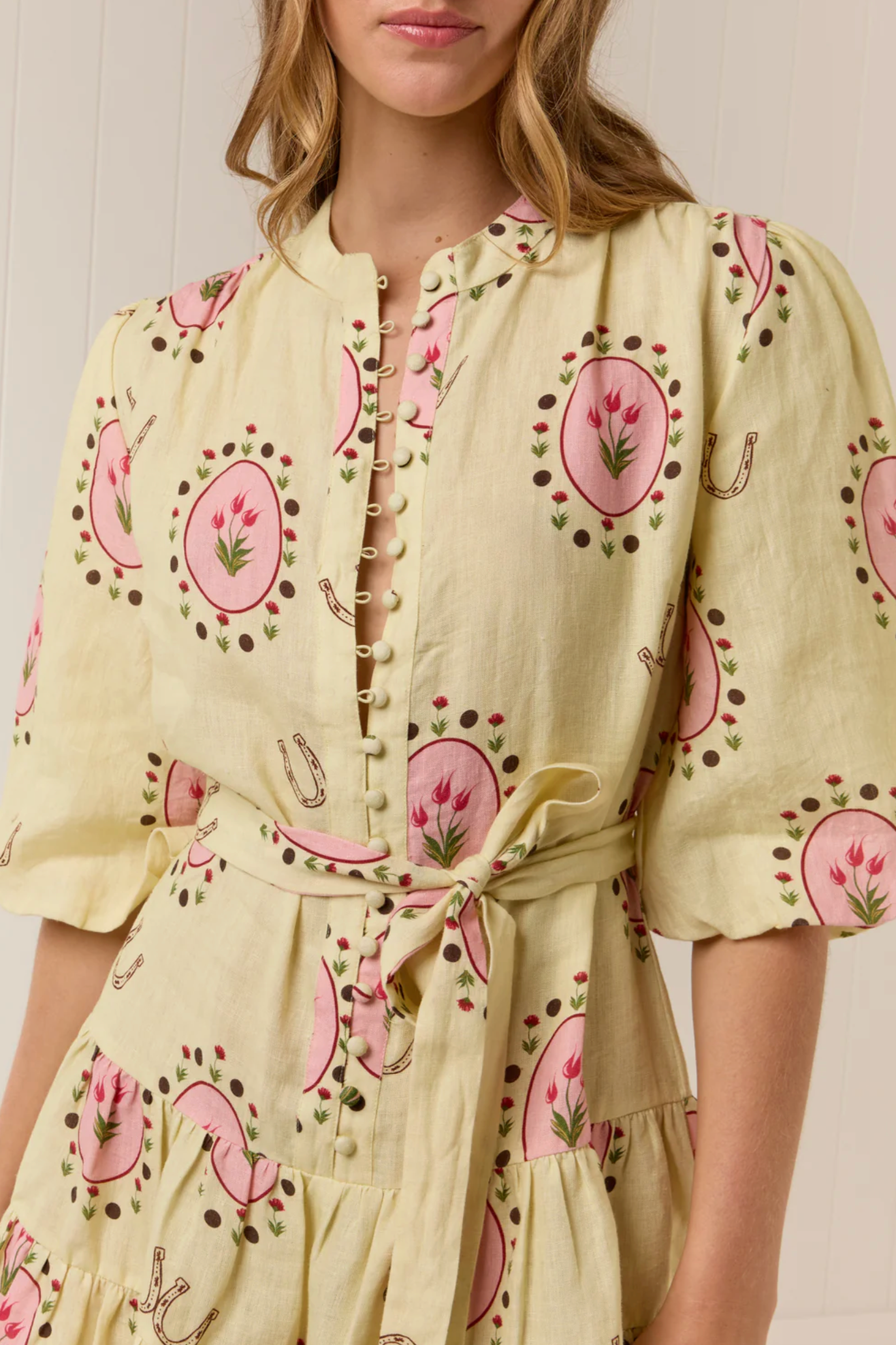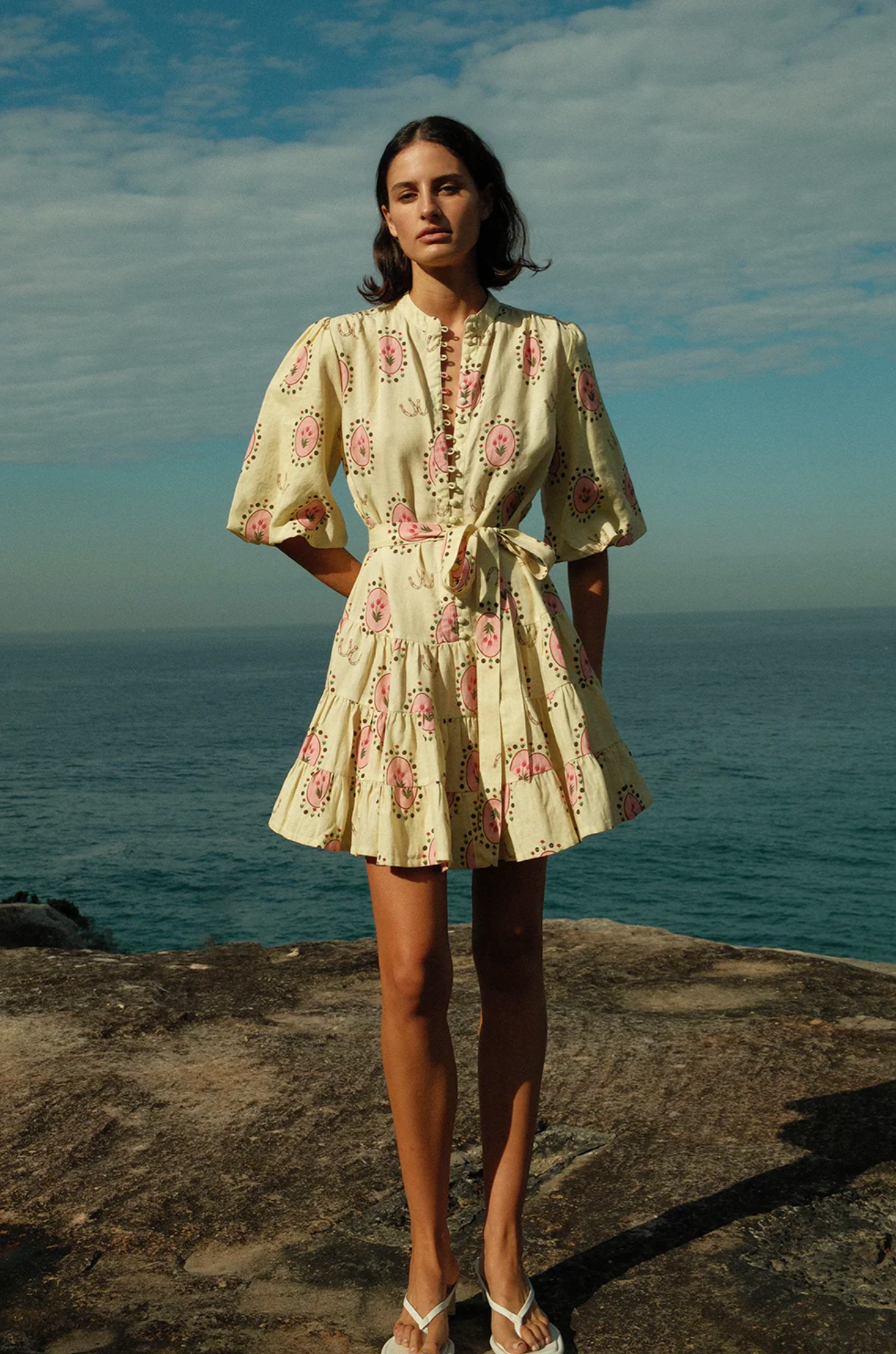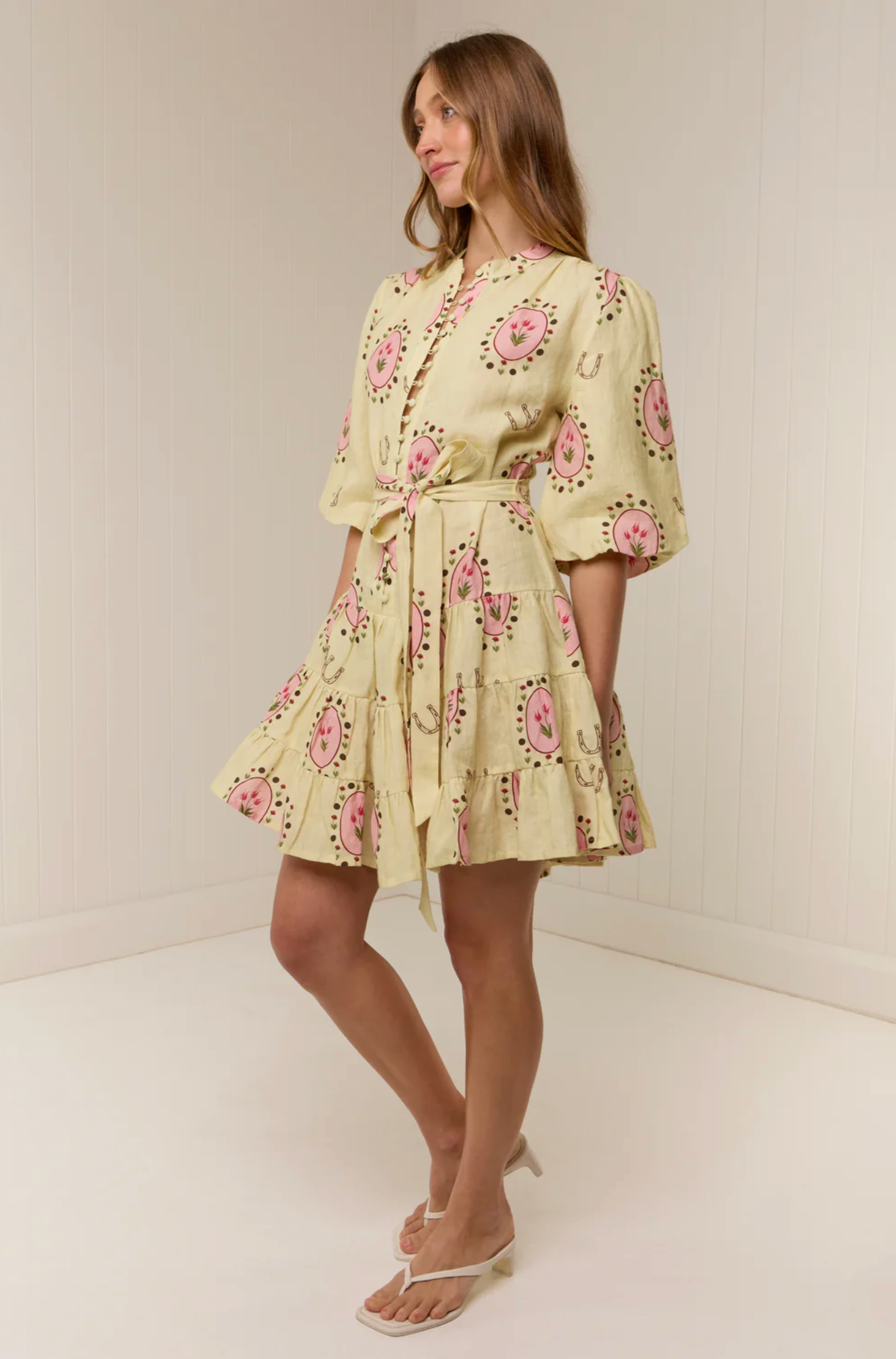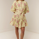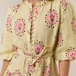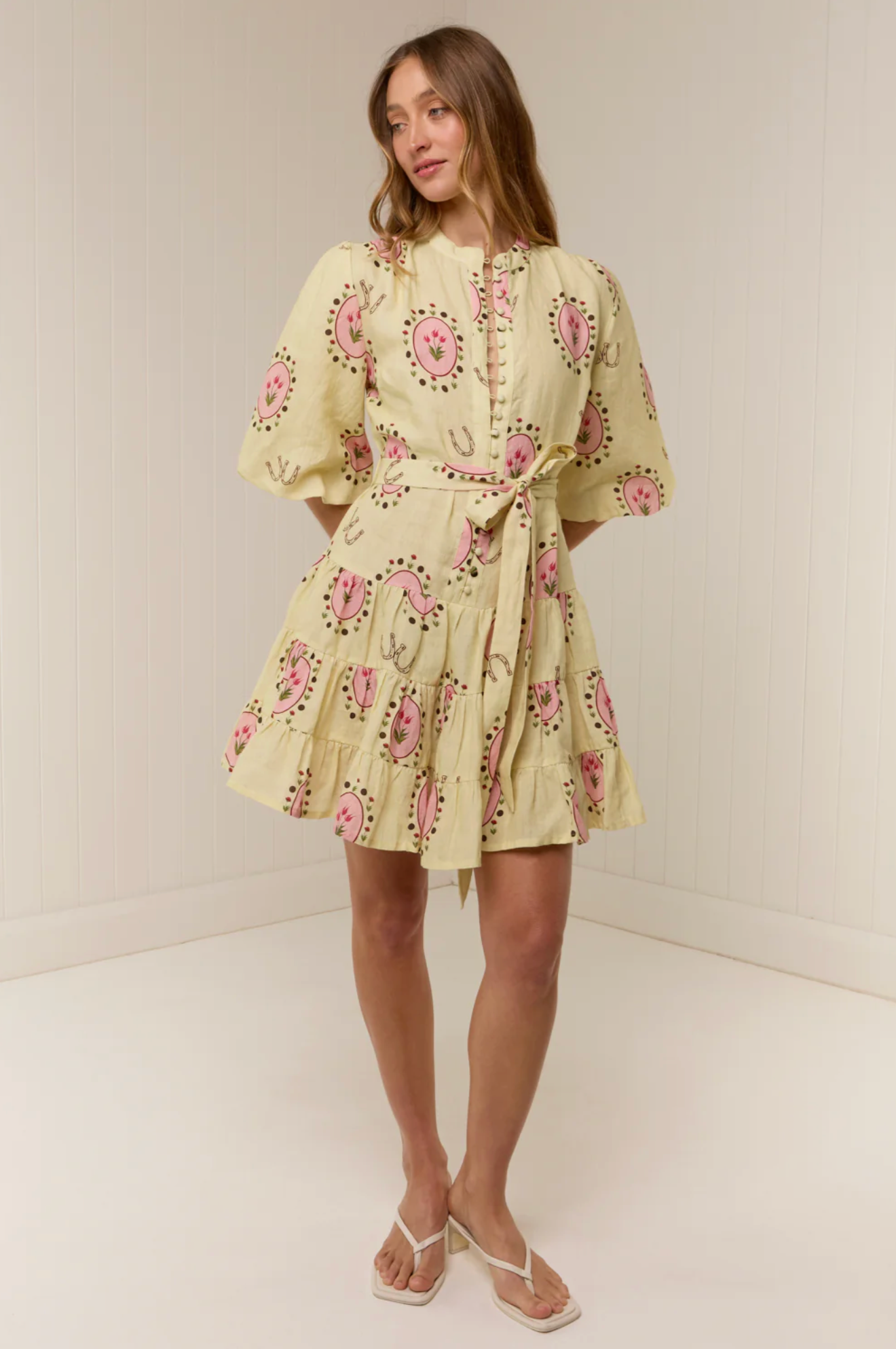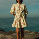 The Ruba Mini Dress in our exclusive Savanna Tile print is crafted in a premium Linen. Designed to be fitted across the shoulders, then loosely sit off the body through the bust and waist, the Ruba Mini Dress features a centre front functional button detailing, blouson half sleeve, drop waist tiered mini skirt and a sash belt to cinch the waist for an elevated feminine fit. Please refer to our size and fit guide for further fit details.