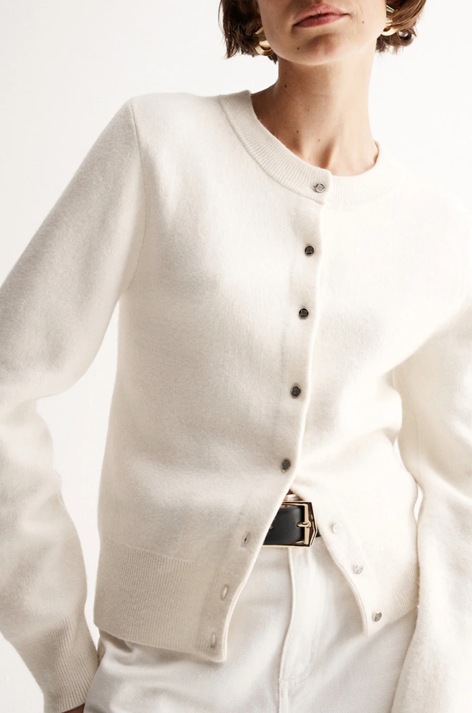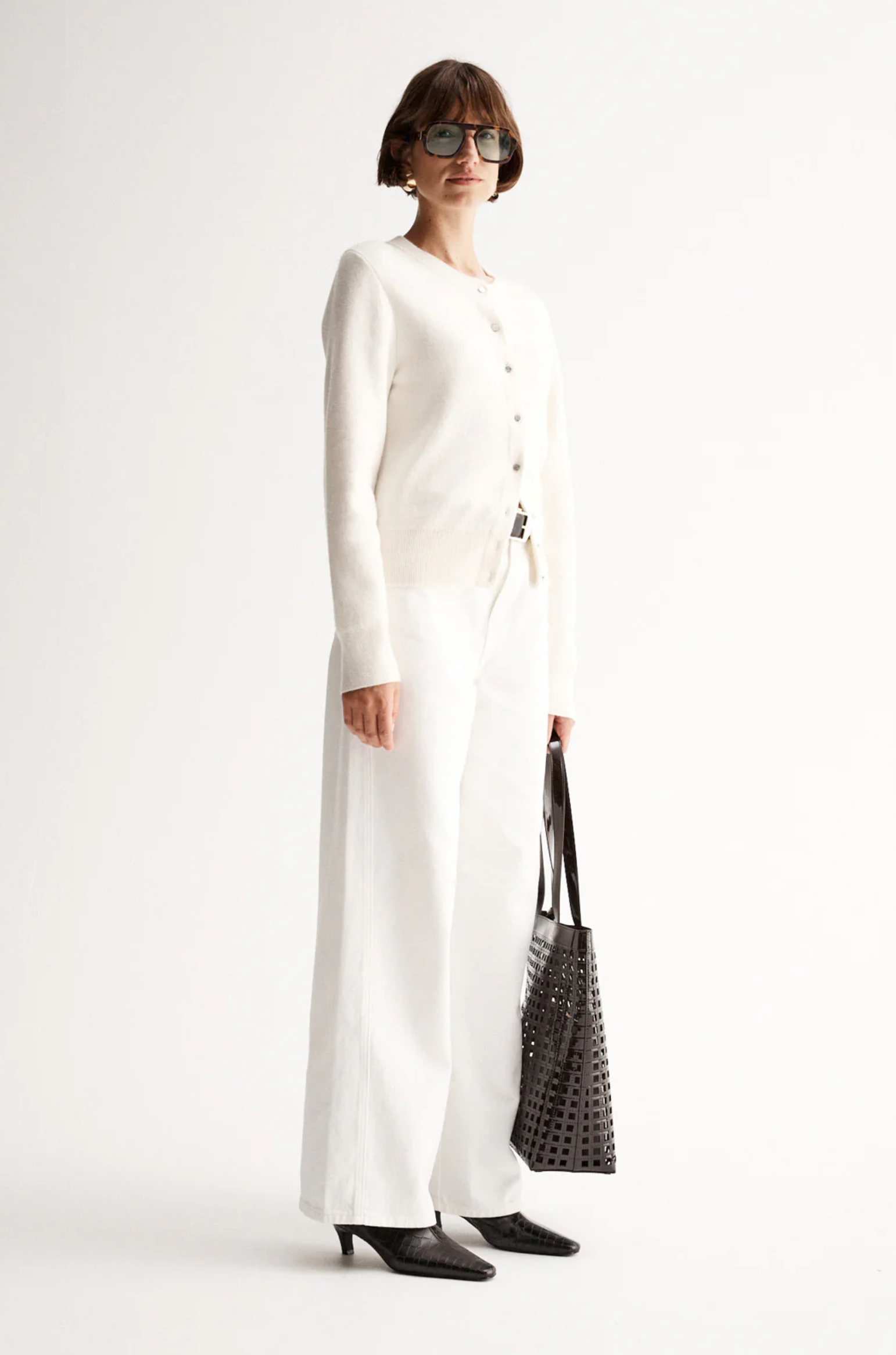 Adding lush winter whites into rotation for the season, the Saschia Cardigan will be a go-to layering piece for everyday outfitting. Made of a thick Merino wool blend knit, this cardigan is cut to a cropped length and regular fit with button down front, crew neckline and full length sleeve. Accentuated with contrast ribbed finishings on the neckline, hem and cuffs, this cardigan transitions effortlessly from day to night.