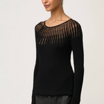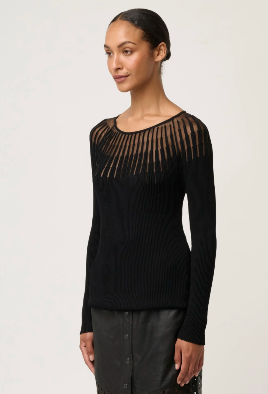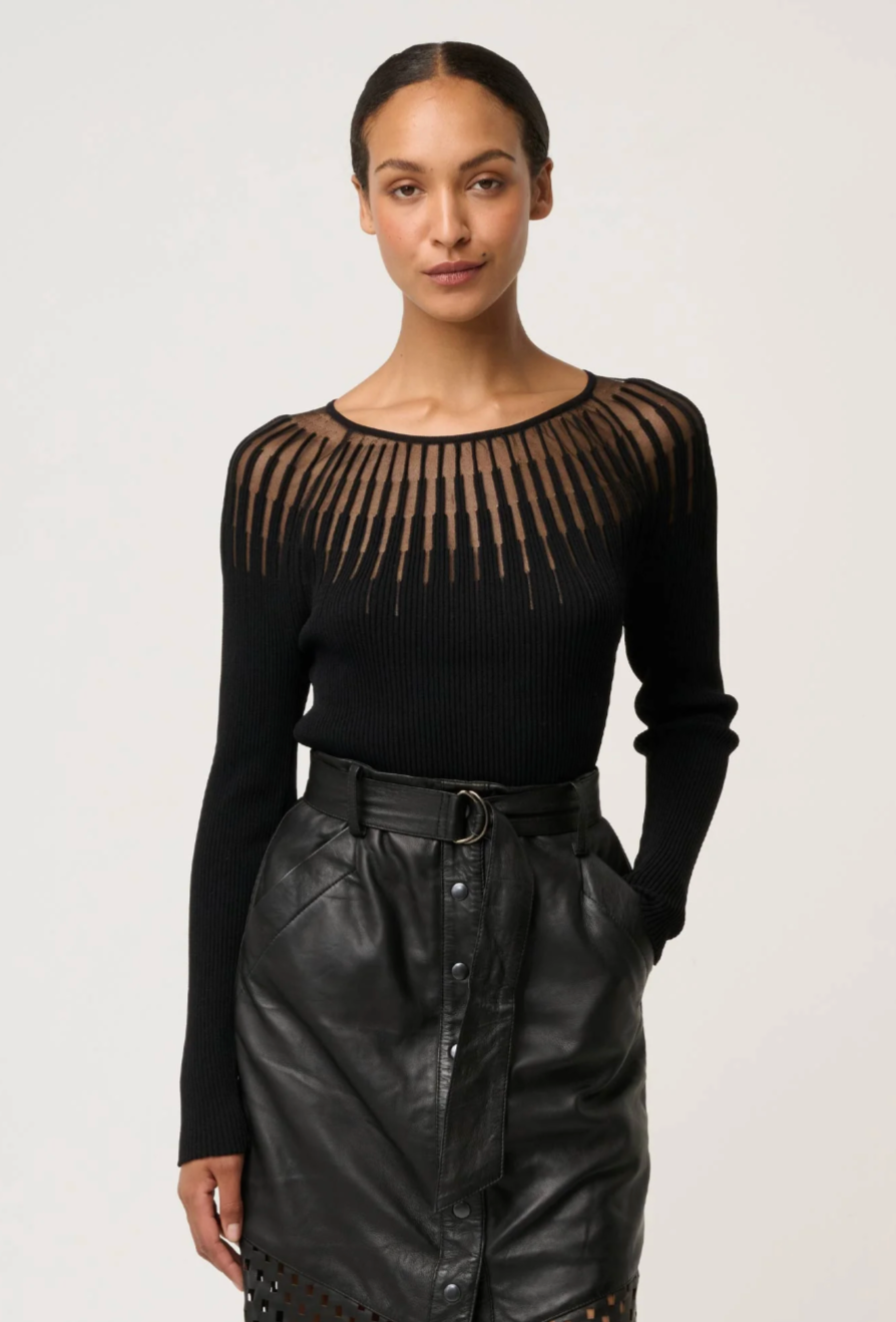 The standout feature is the sheer neckline detailing, creating a subtle yet striking contrast against the ribbed knit body. This semi-sheer panel adds a sophisticated edge while maintaining a timeless silhouette. Finished with a wide scoop neckline and fitted sleeves, the Rhiannon top is perfect for layering or wearing on its own for a polished look.