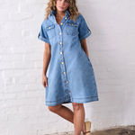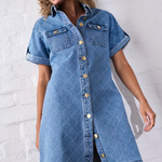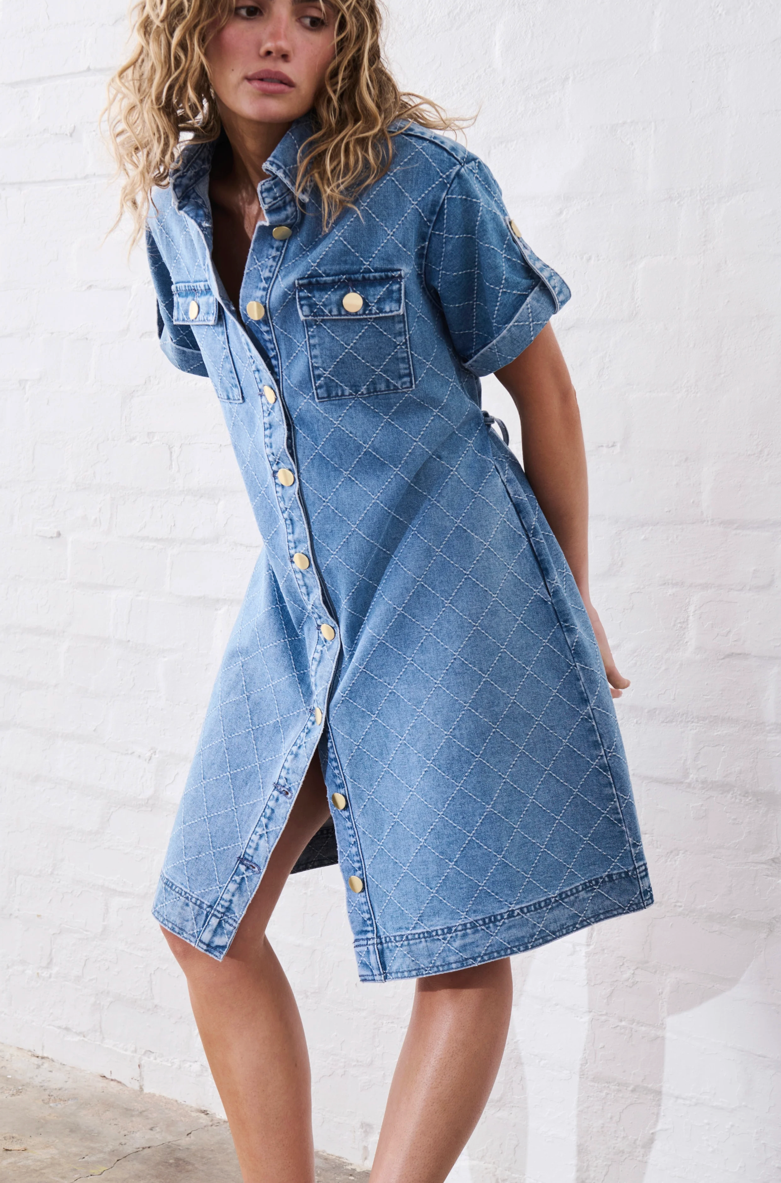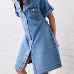The Simone Dress is the easy mini shirtdress with a cool twist. Featuring patch utility pockets, buttons all down the front and an check stitch detail this is one-and-done kind of style that can be paired with sneakers for a cool, casual vibe.