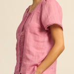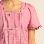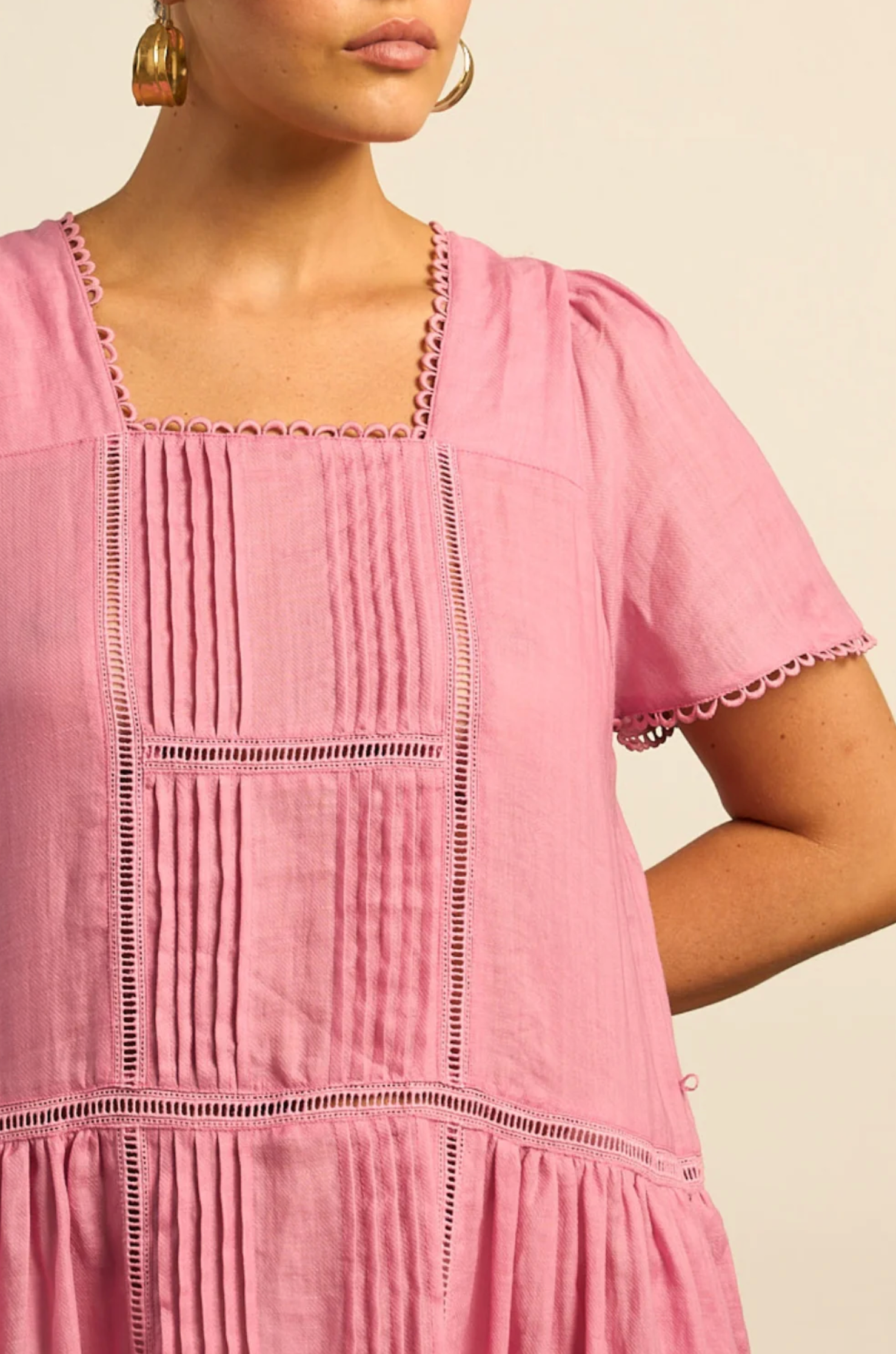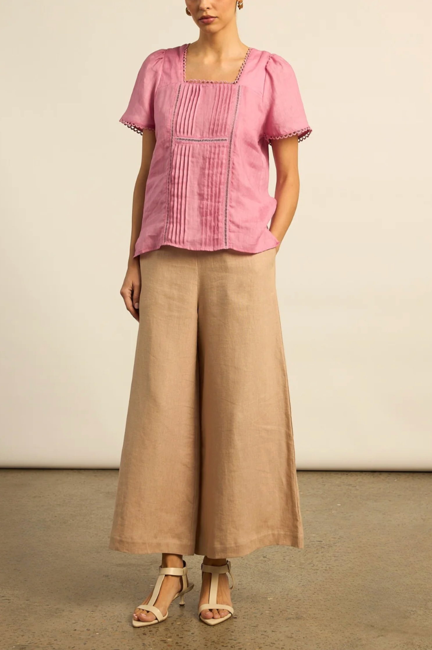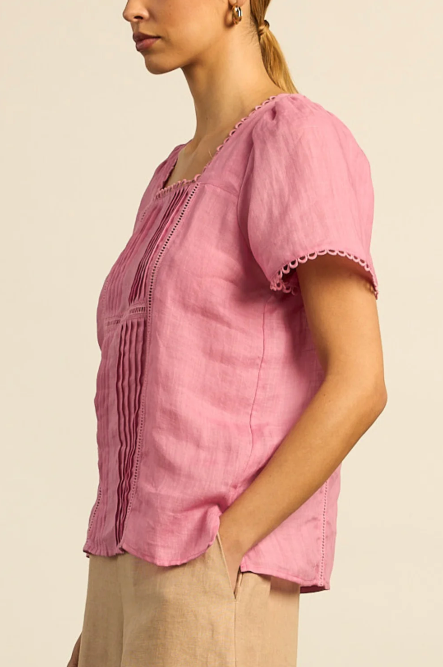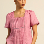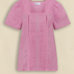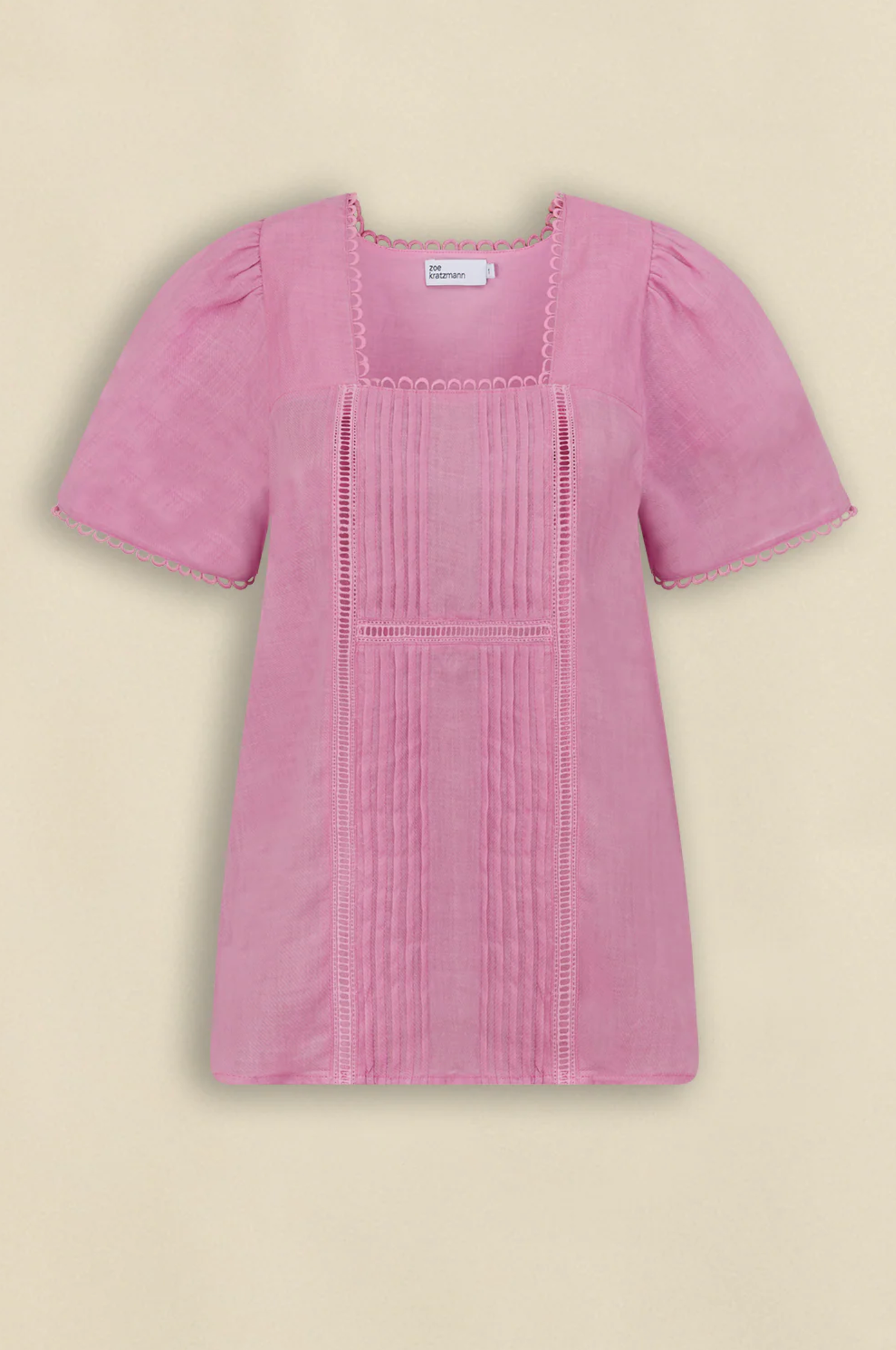 shaped with a feminine square neckline, finished with scalloped lace trims. Pin tucks and ladder-lace inserts create subtle structure, while gathering at the shoulders lends soft volume through the sleeves. relaxed yet refined, it’s a versatile piece designed for elevated everyday wear.