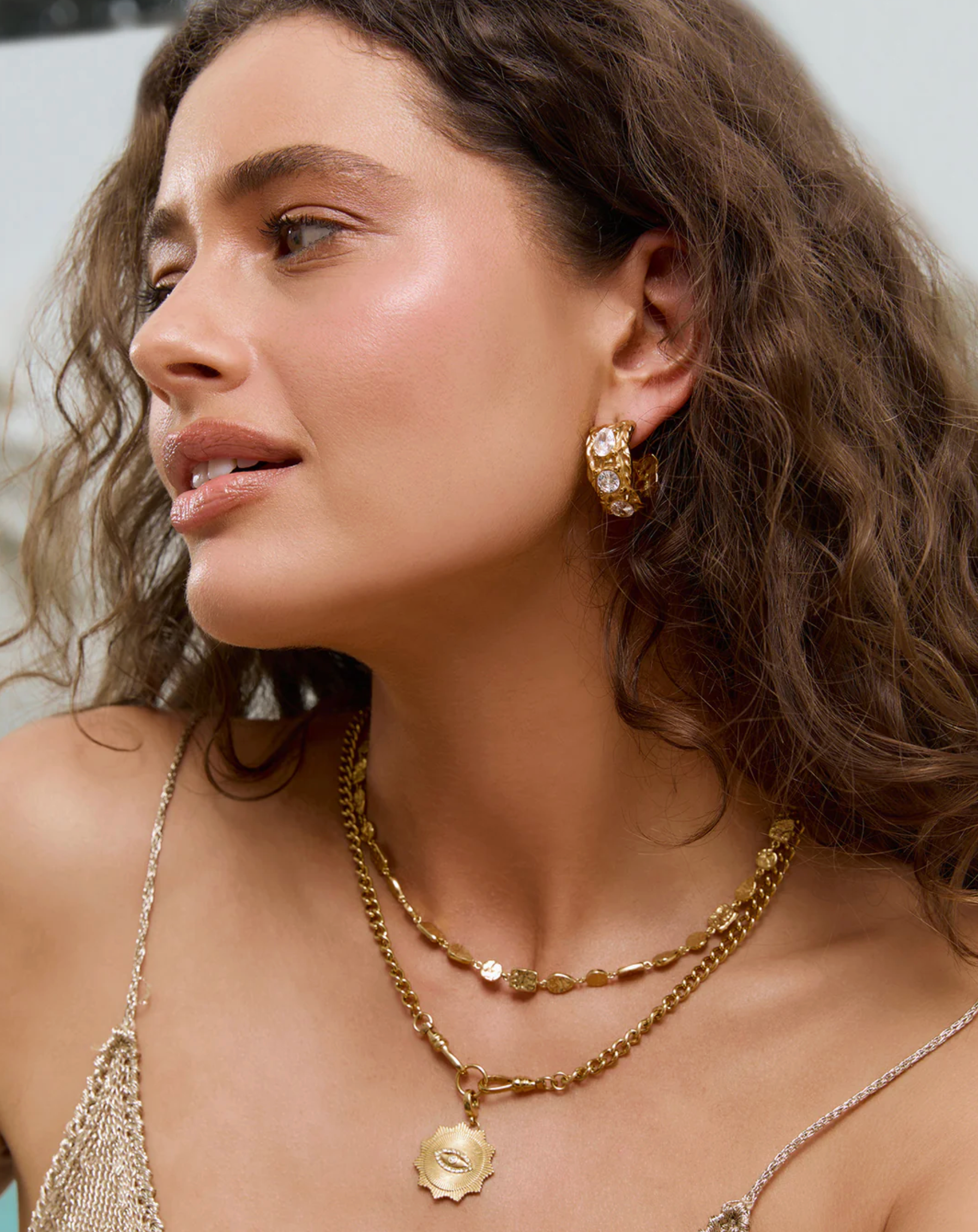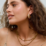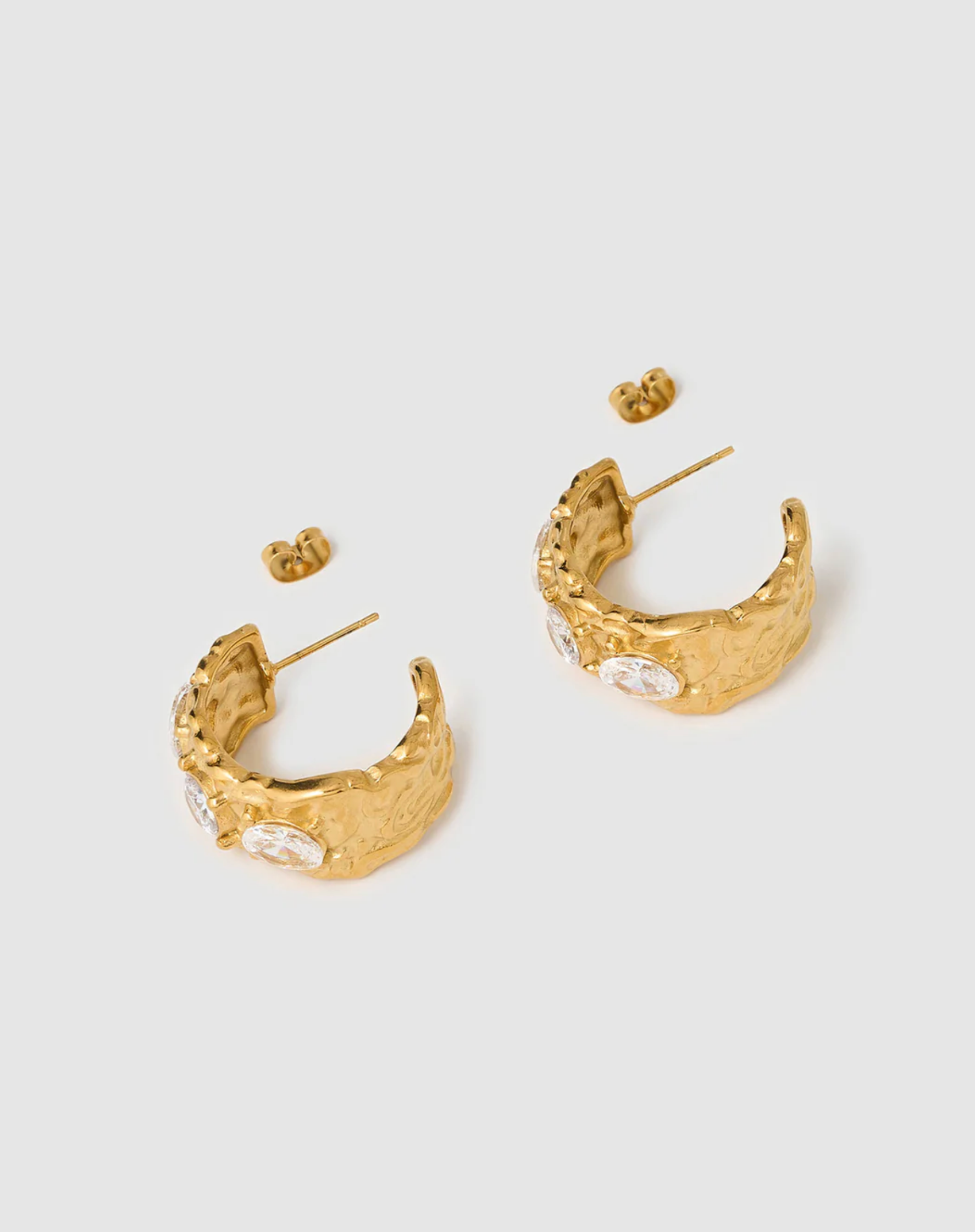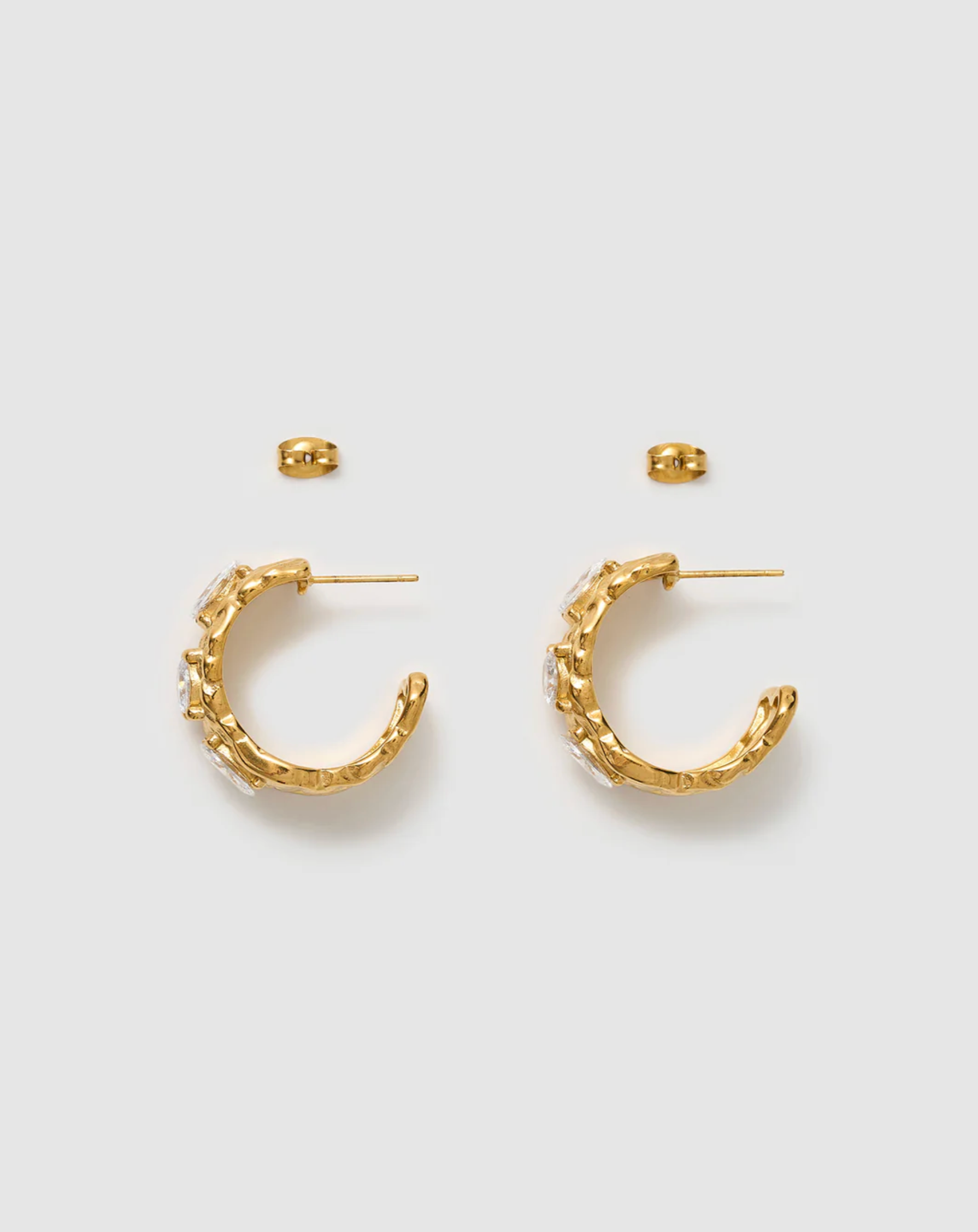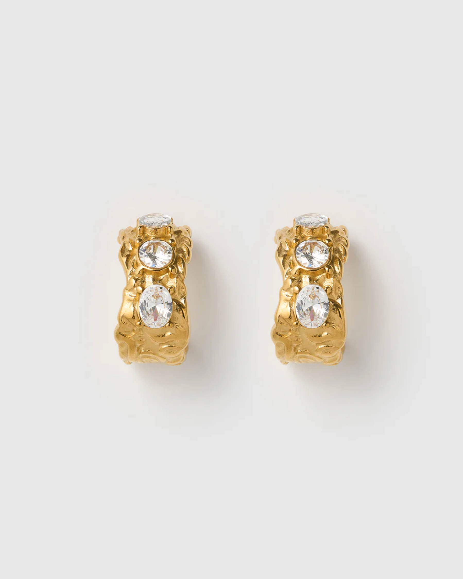 Golden glamour reaches new heights with the Roxy Earrings, designed to rock your world. Featuring three striking statement stones, these hoops bring bold sparkle and elegance, making them the perfect finishing touch to any evening look.