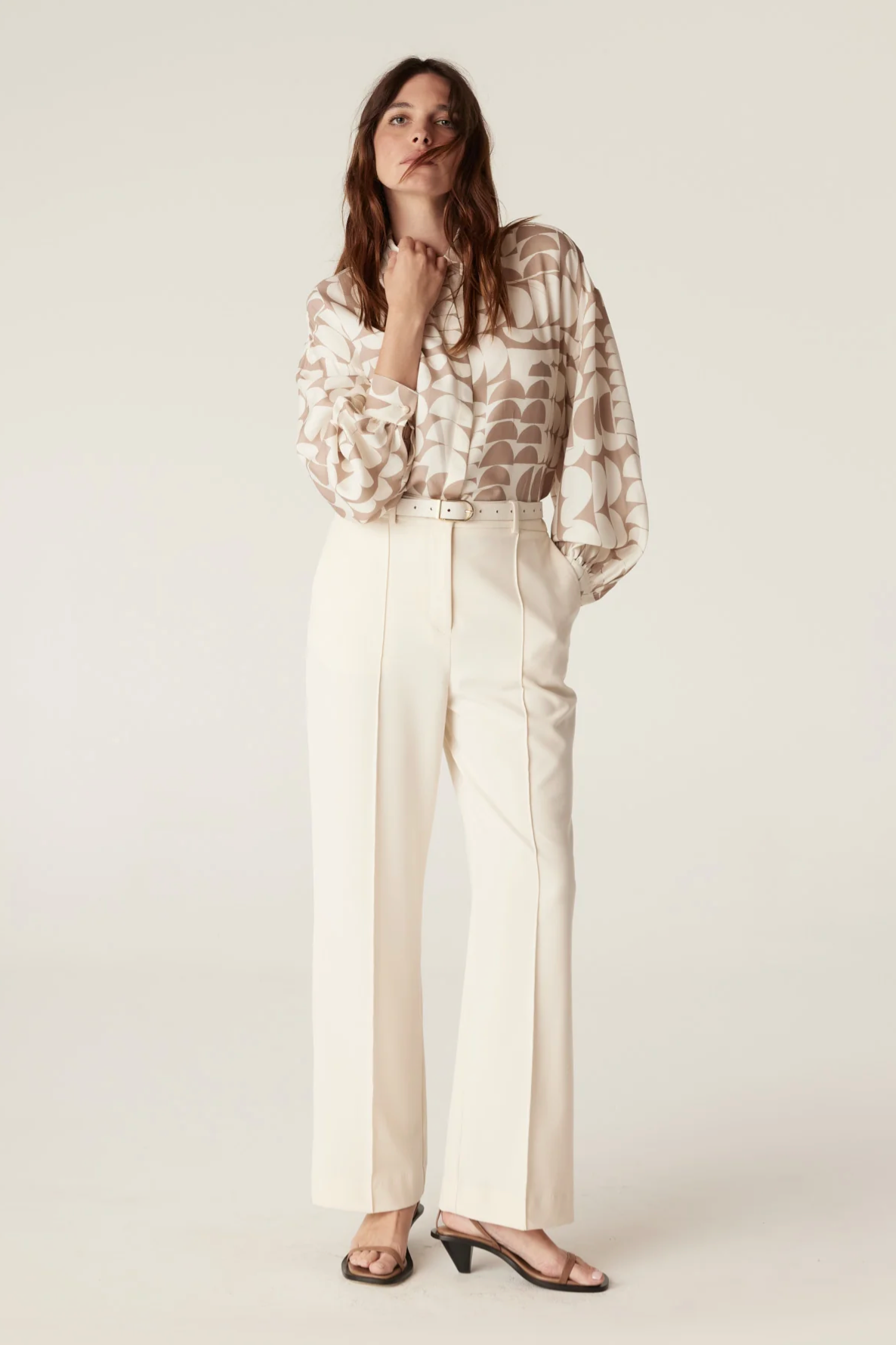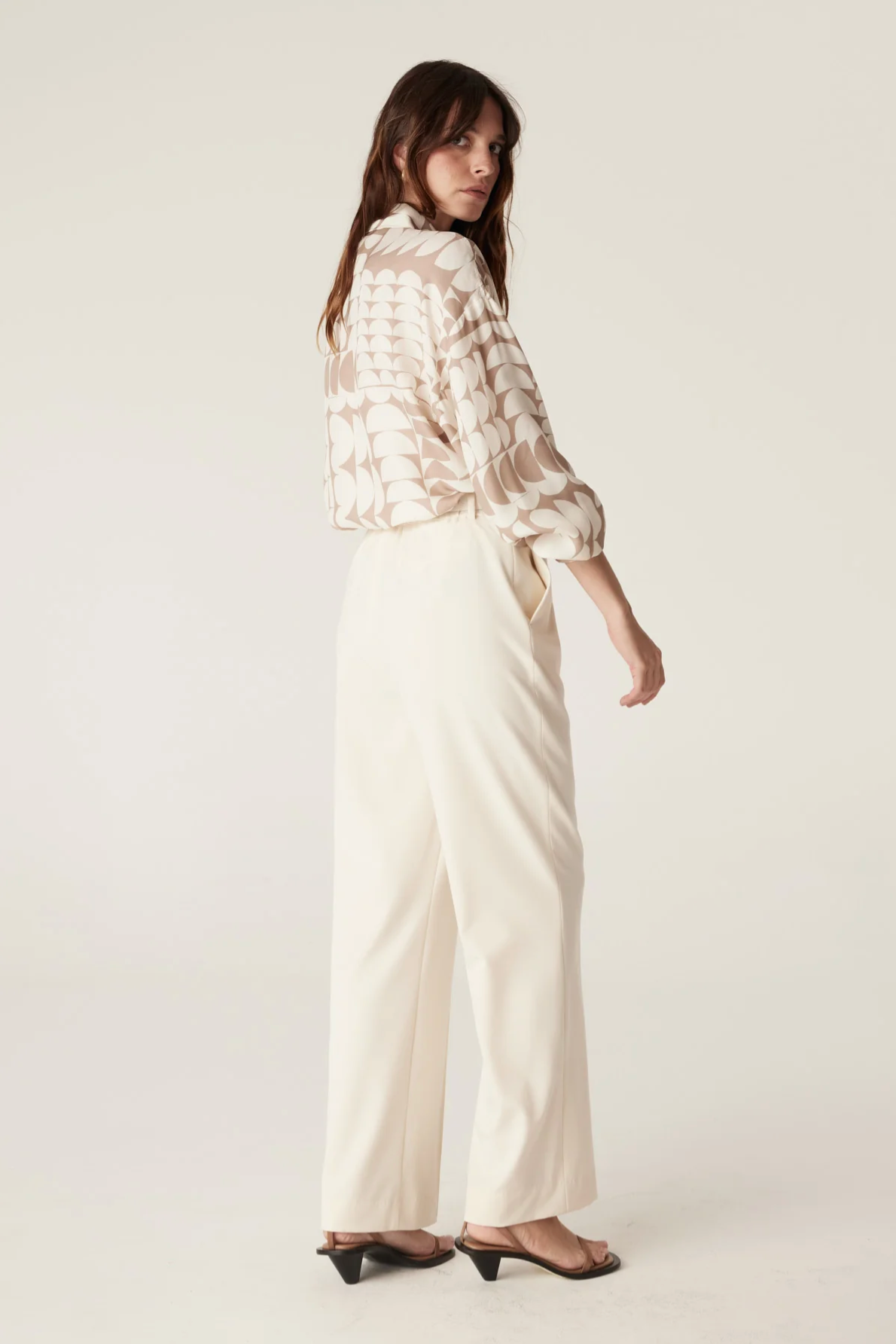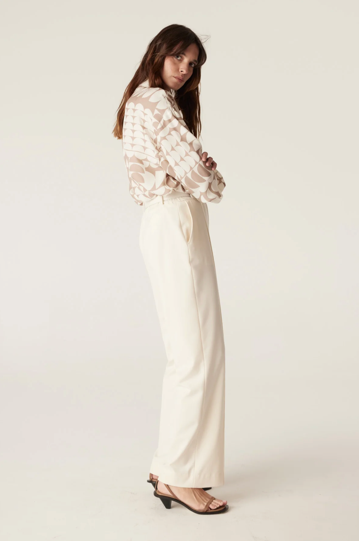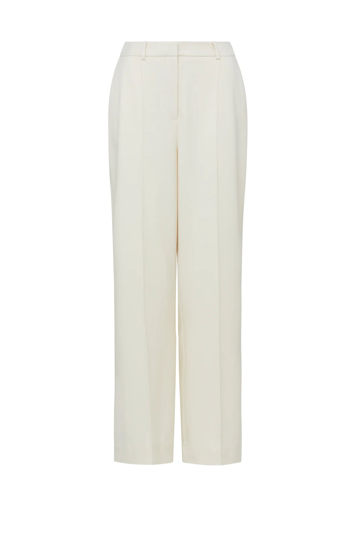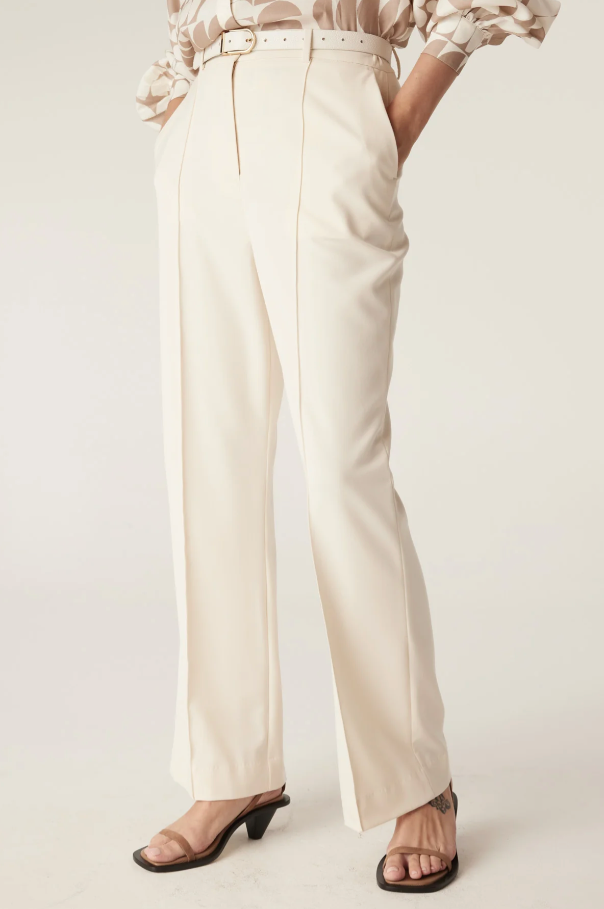 The Tate Wide Leg Pant features a high waisted, regular fit silhouette accented by center front pintucks. These pants include belt loops, an elasticated back waistband for added comfort, and a front zip fly with button closure.