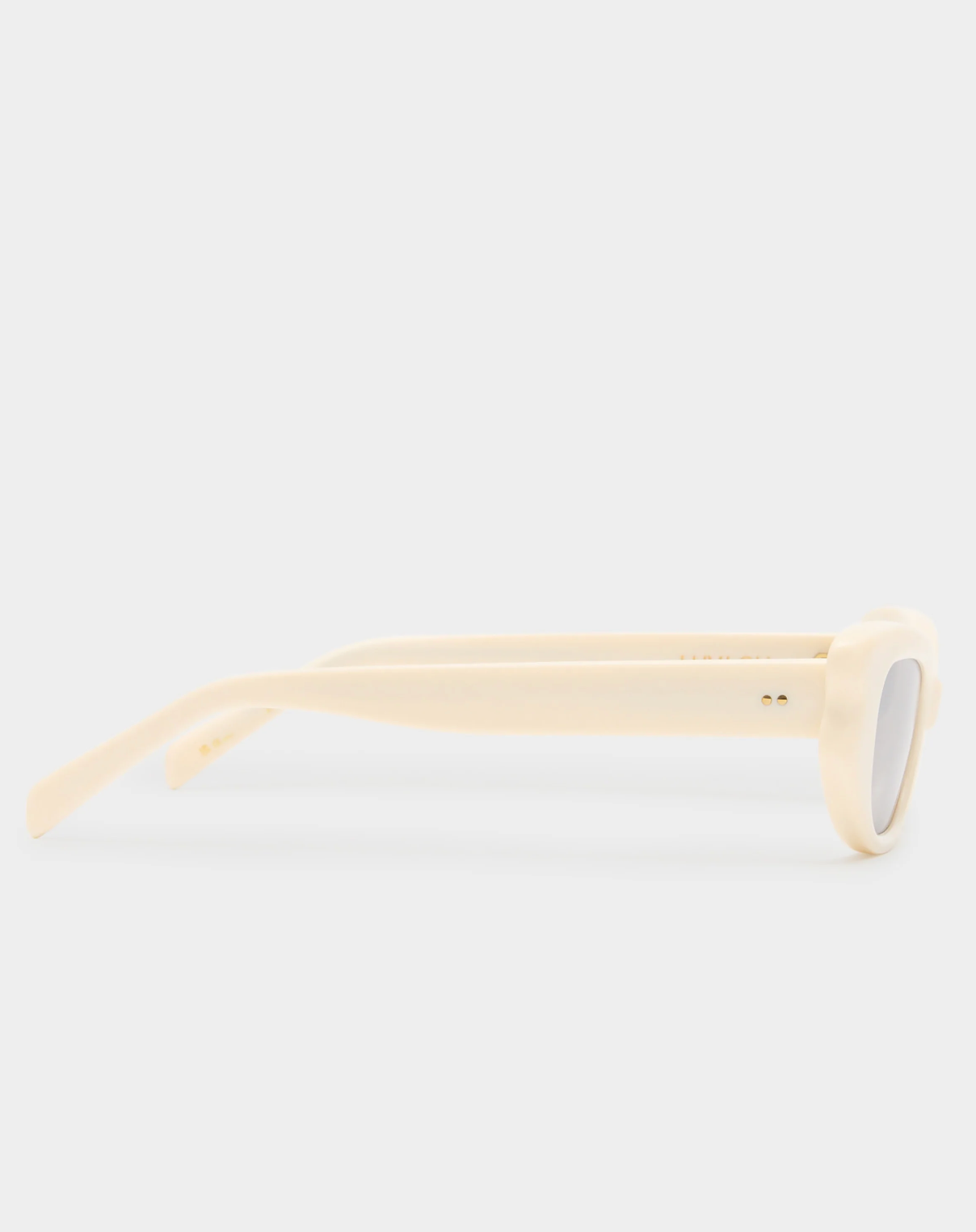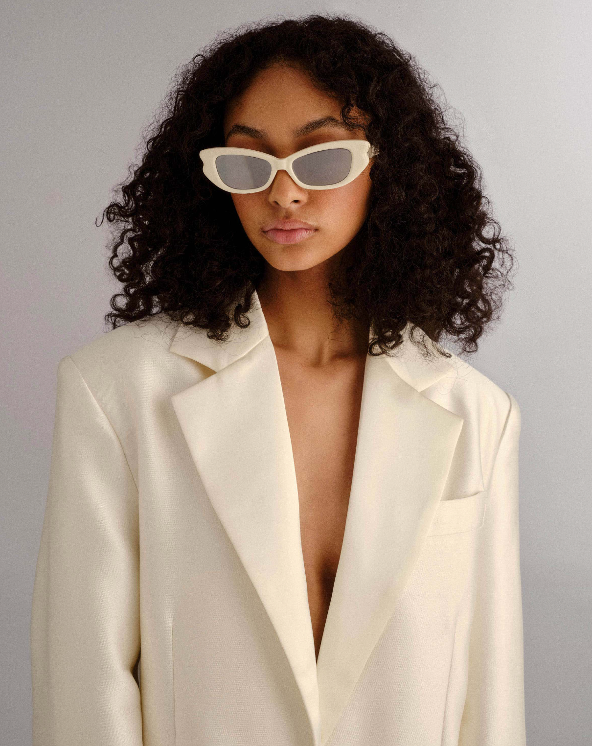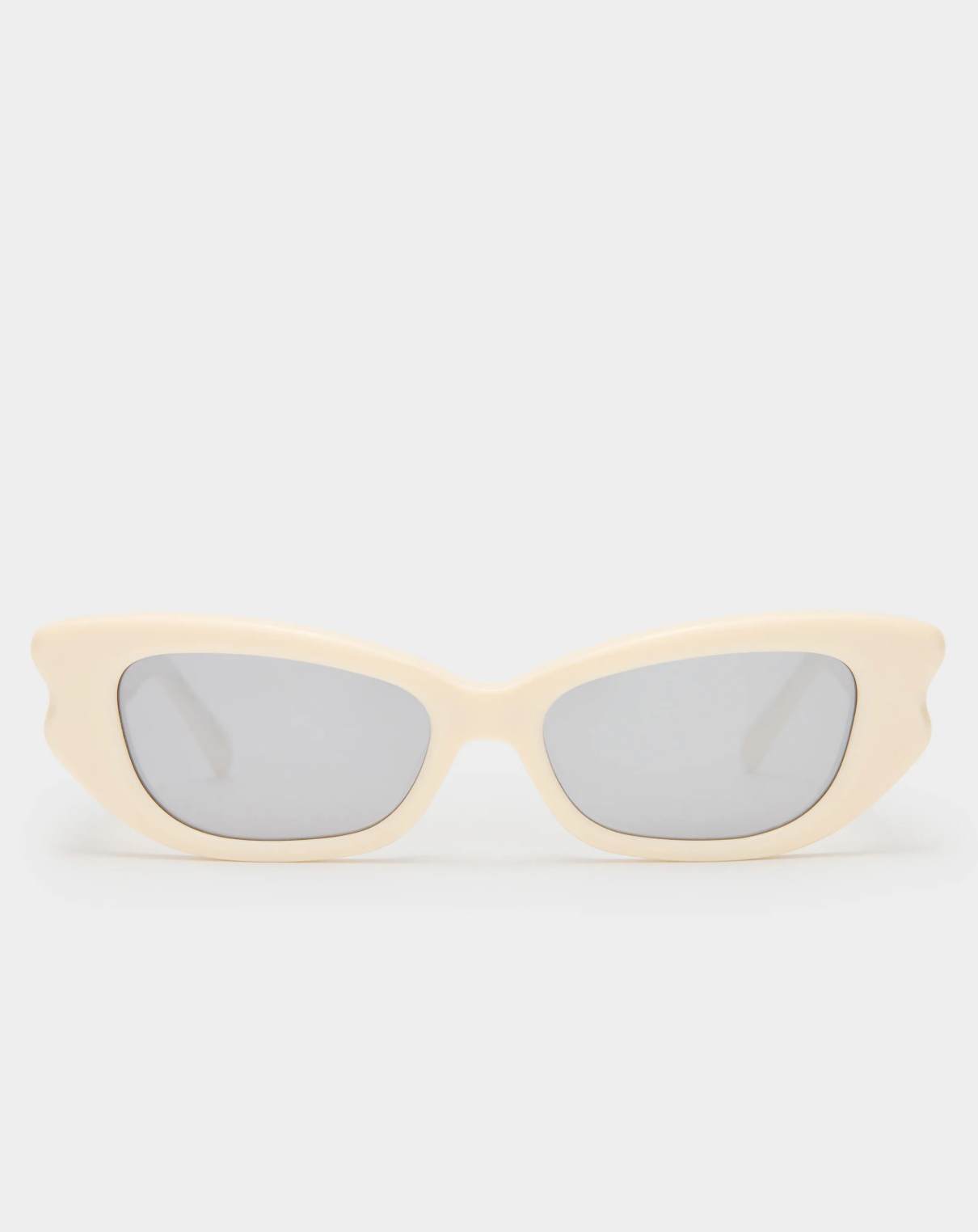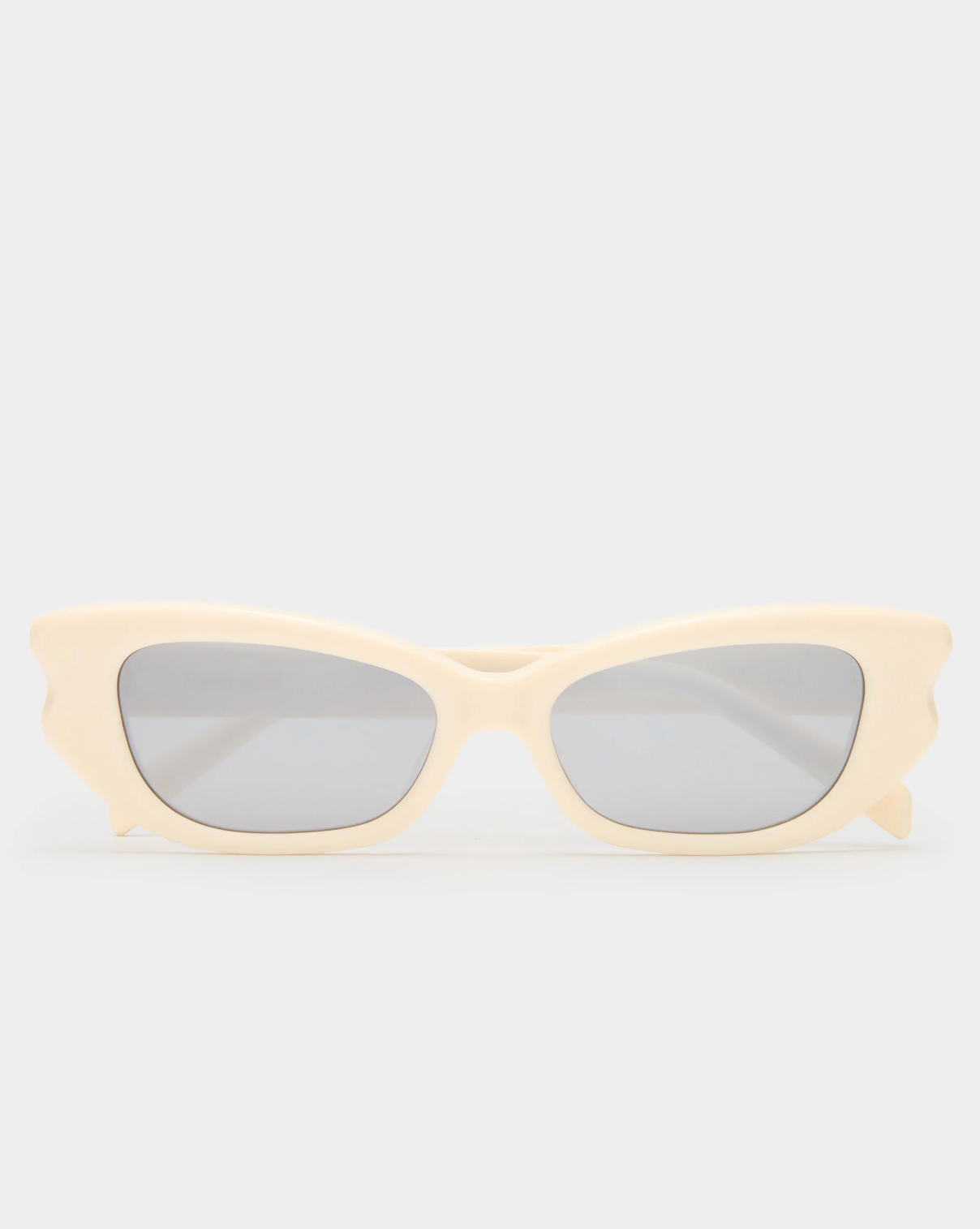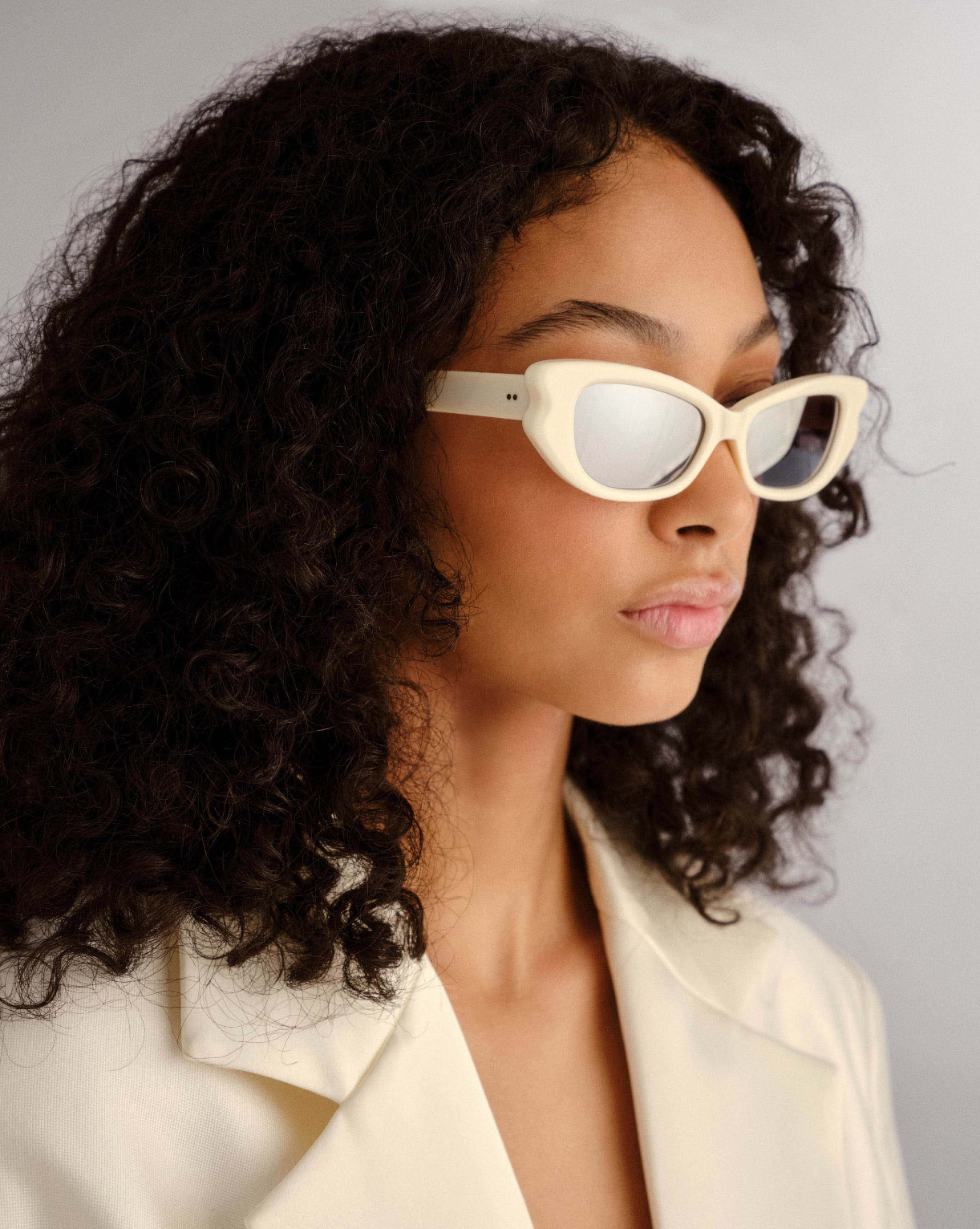 The Elle is a petite cat eye frame with a refined scalloped trim creating a subtle statement within its design. Handcrafted with premium bone acetate and a silver mirror lens this frame encapsulates spirited sophistication.