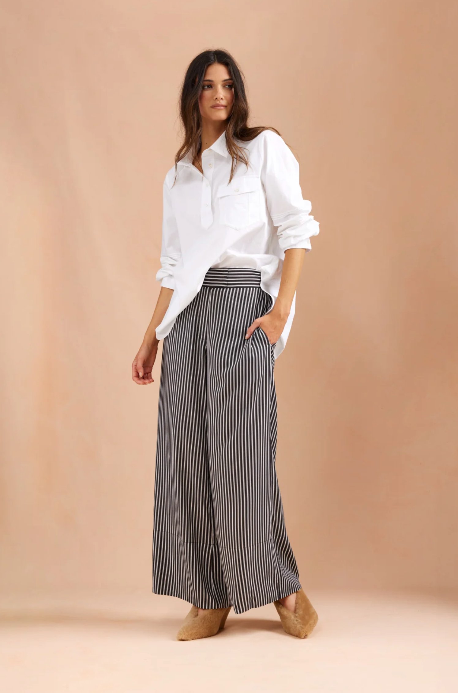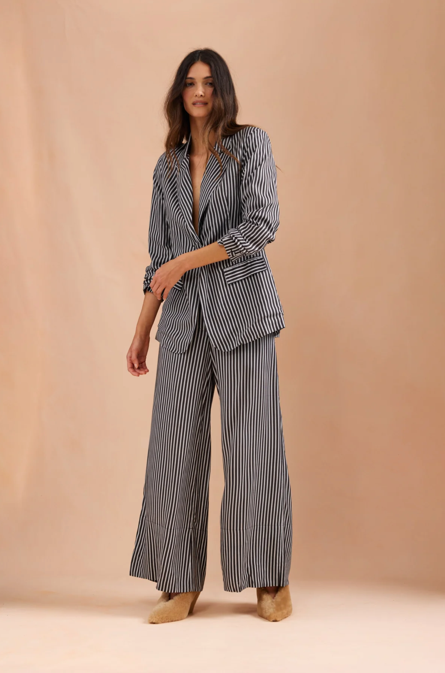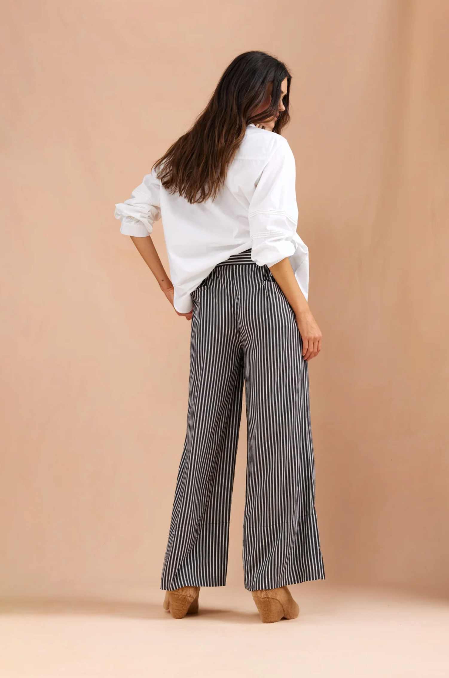 "Your never fully dressed without a smile" - Annie’s famous lines match the iconic other Annie these pants are named after. Holds court & holds the room. She's a keeper and there for every sort of occasion & brings a special sort of charisma. With a swishy wide leg, pinstripe drama and an elasticated back waist, these trousers were made for leading ladies (and spontaneous musical numbers). Cut from matte viscose and full of movement. No hard knock life here, just a fabulous pair of pants.
