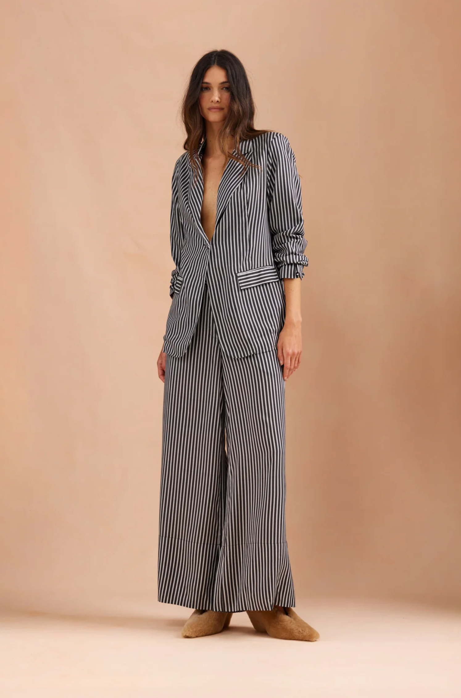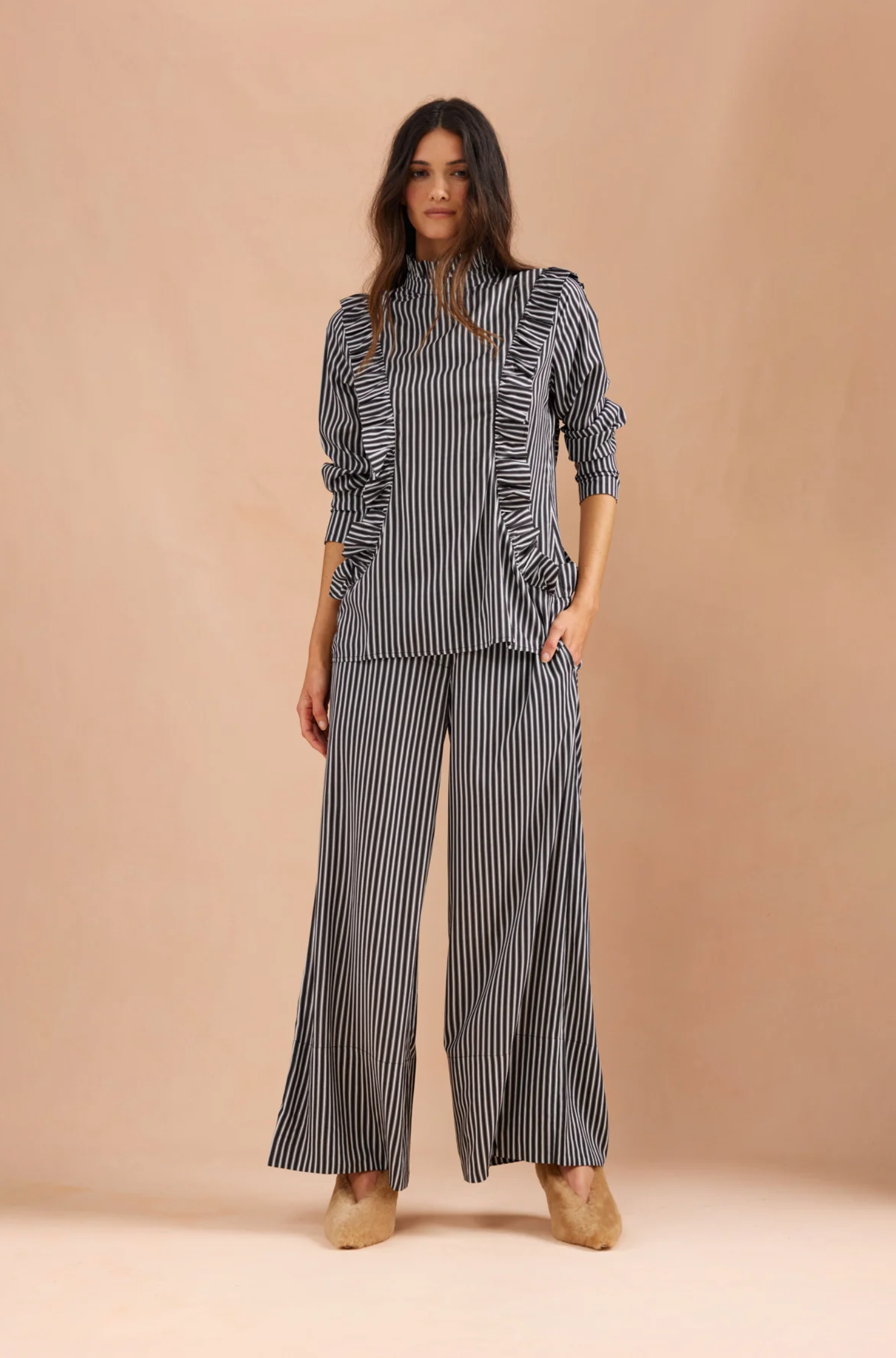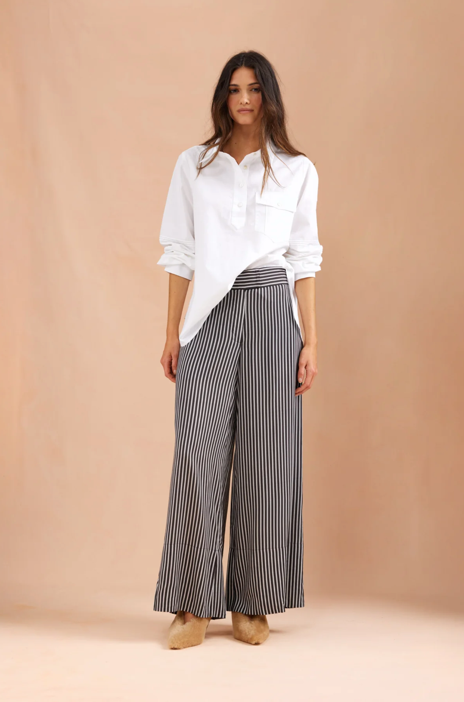 "Your never fully dressed without a smile" - Annie’s famous lines match the iconic other Annie these pants are named after. Holds court & holds the room. She's a keeper and there for every sort of occasion & brings a special sort of charisma. With a swishy wide leg, pinstripe drama and an elasticated back waist, these trousers were made for leading ladies (and spontaneous musical numbers). Cut from matte viscose and full of movement. No hard knock life here, just a fabulous pair of pants.