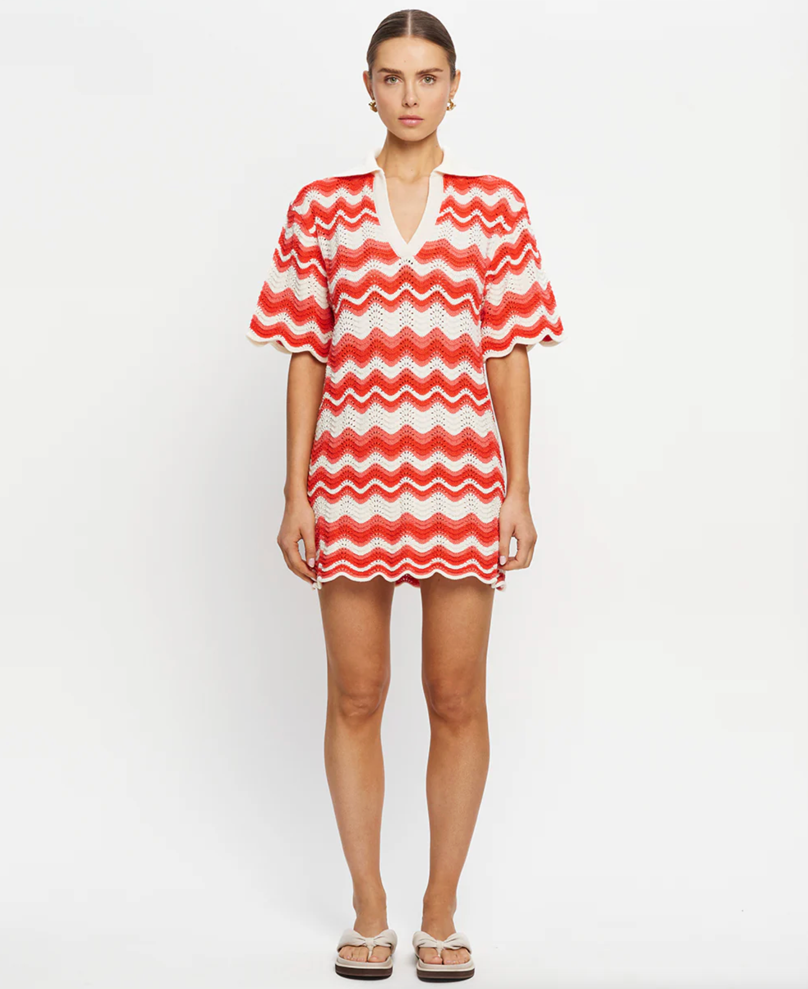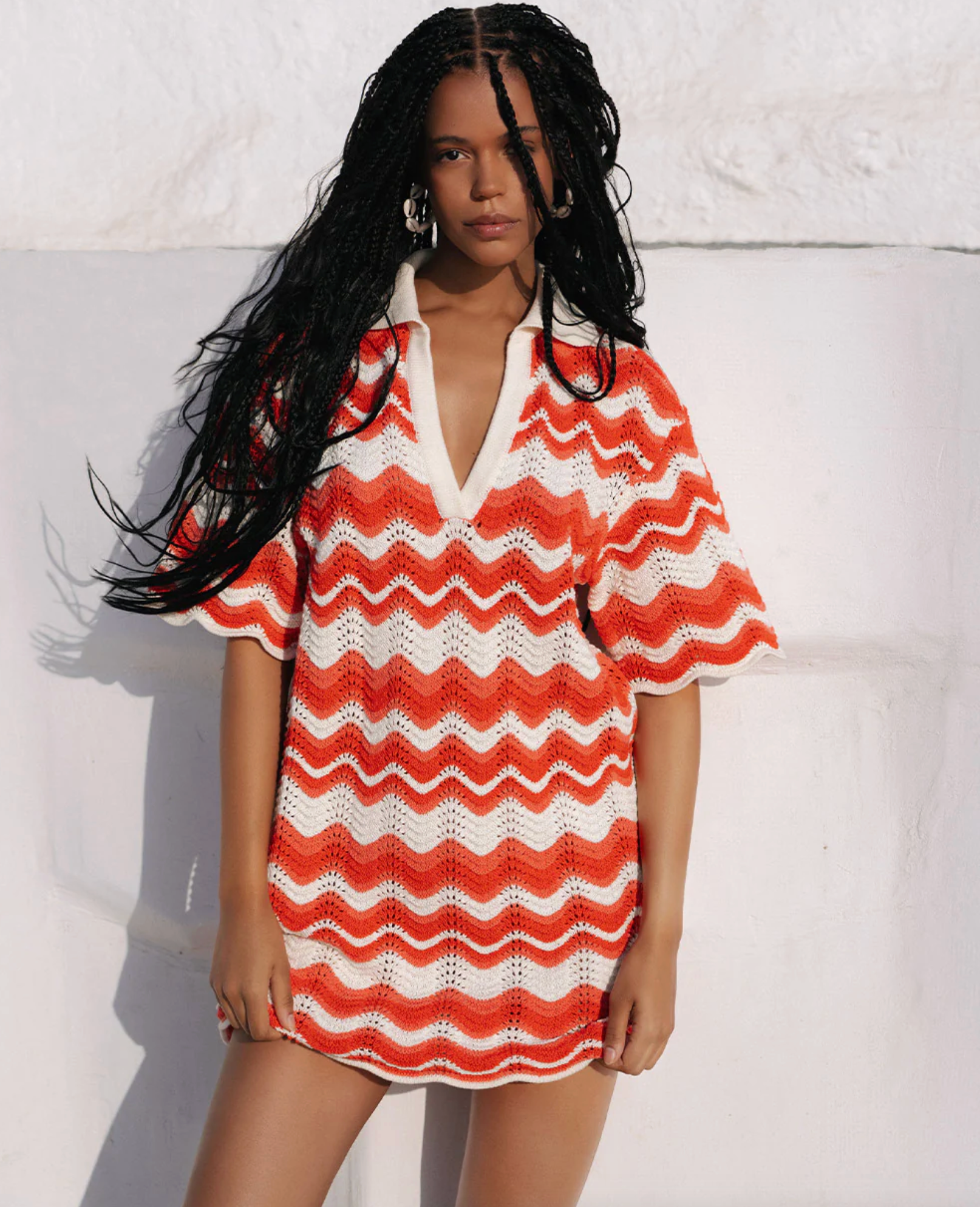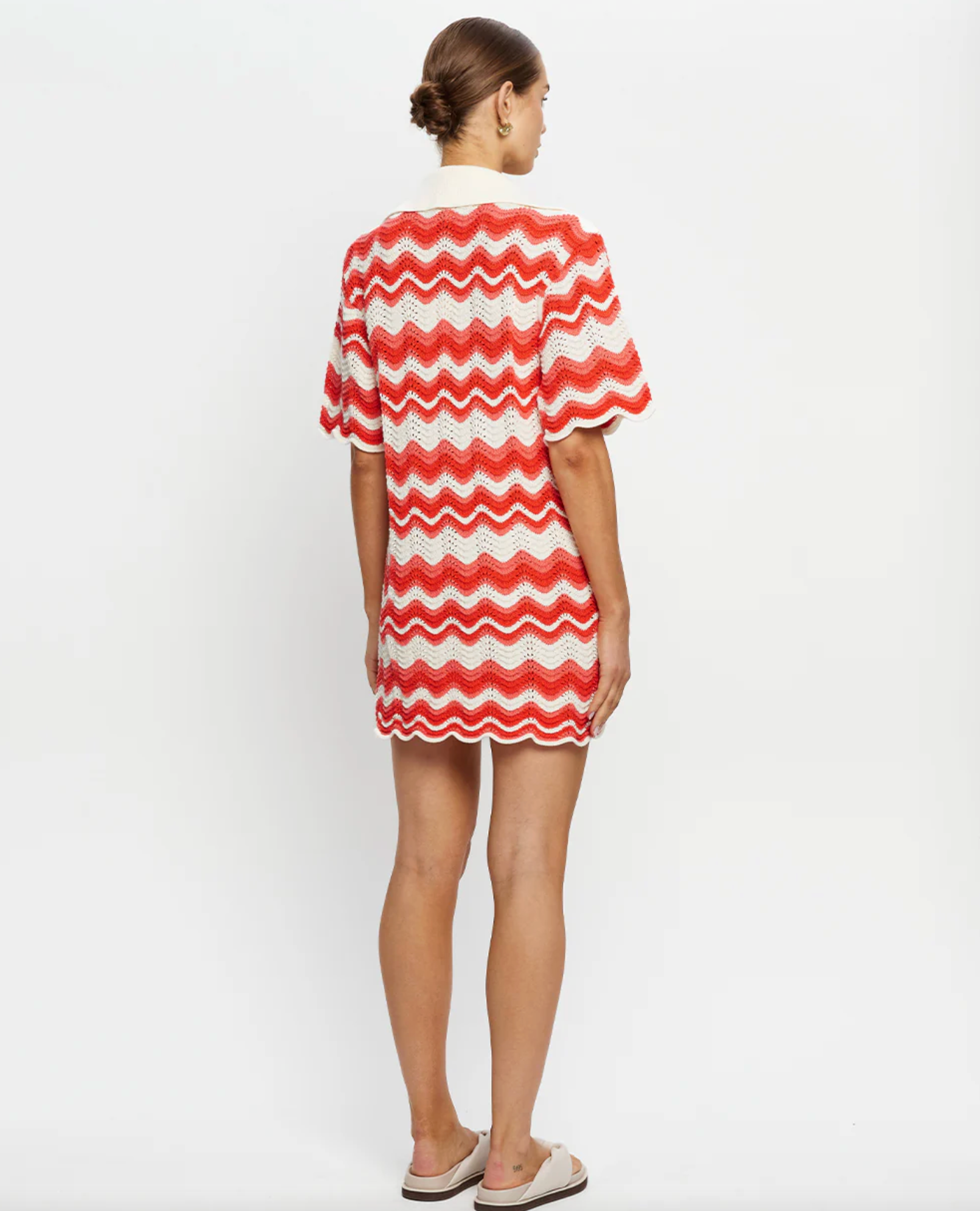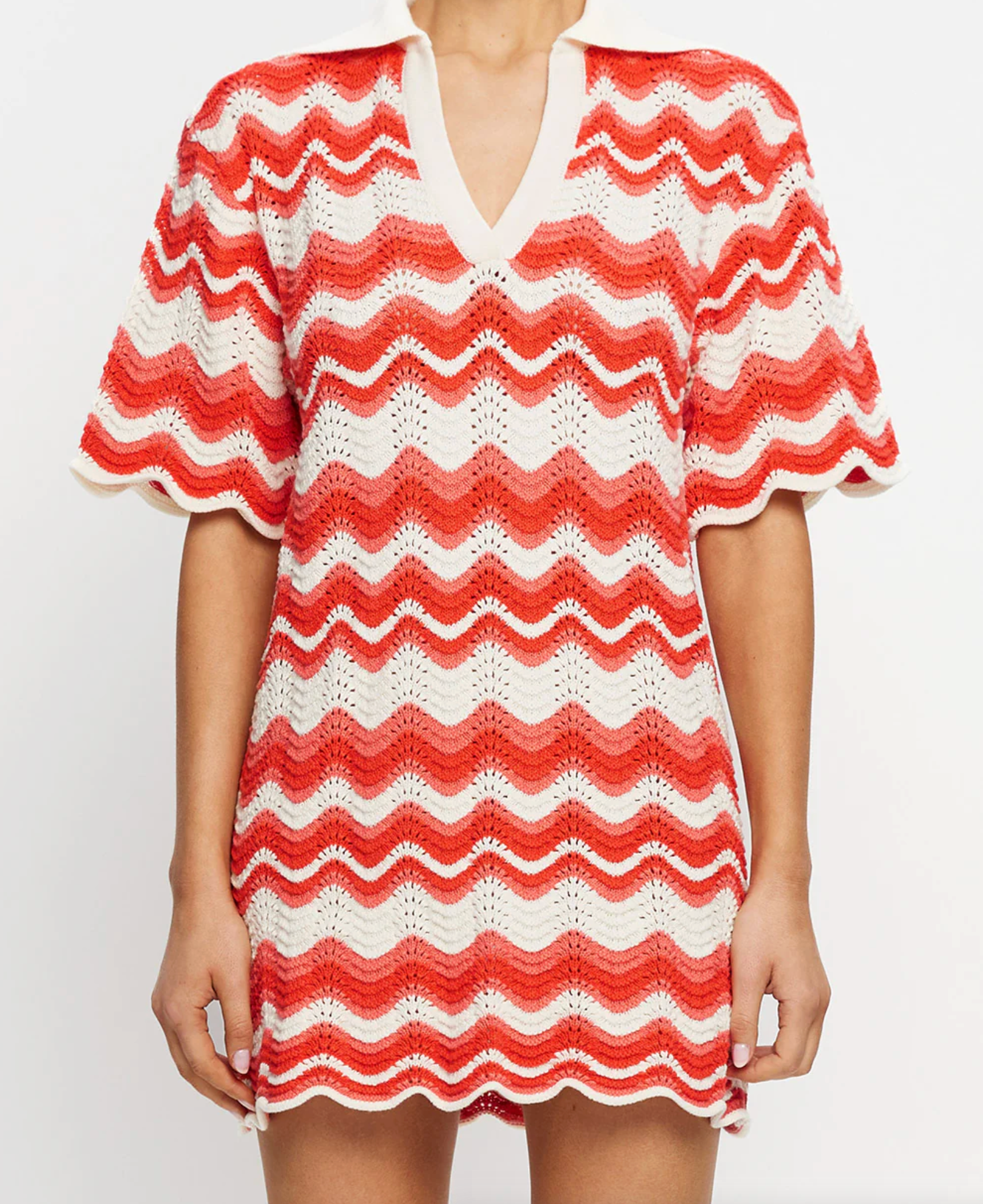 The Leighton Mini Dress in coral is crafted from an intricate wave-knit stitch in a relaxed silhouette, featuring a ribbed collar and scalloped edging at the hem and sleeves. Designed to feel lightweight and effortless, it’s a modern knit made for warm-weather styling. Pair with sandals for relaxed daytime plans and coastal escapes.