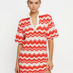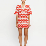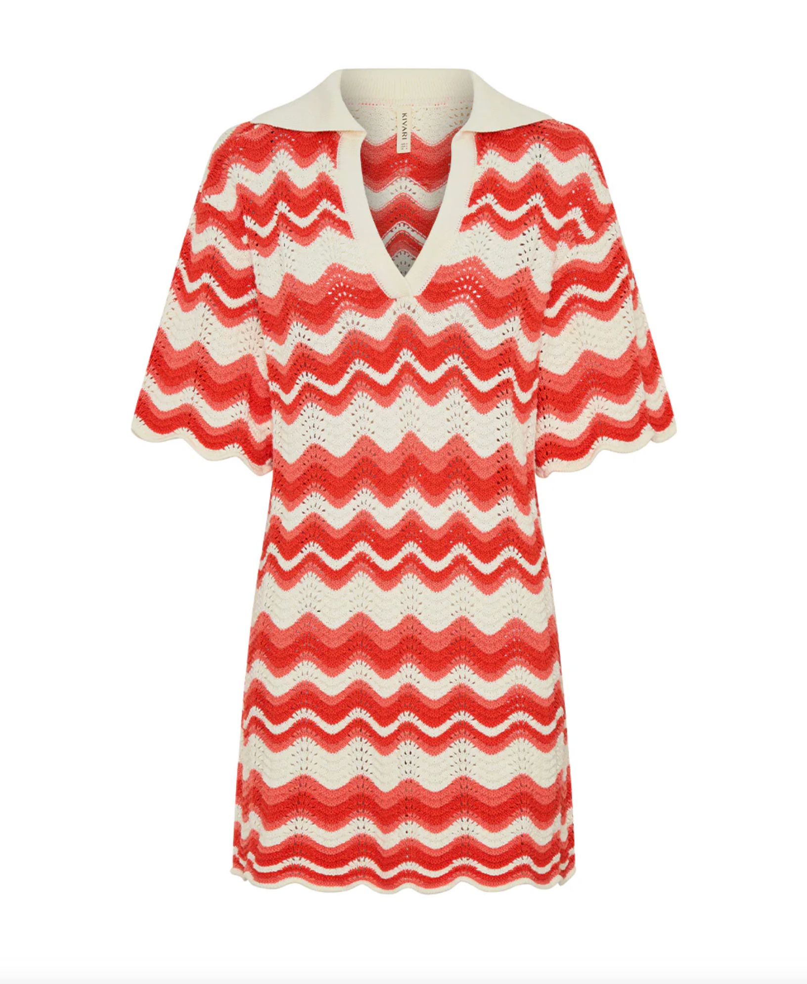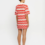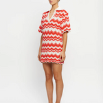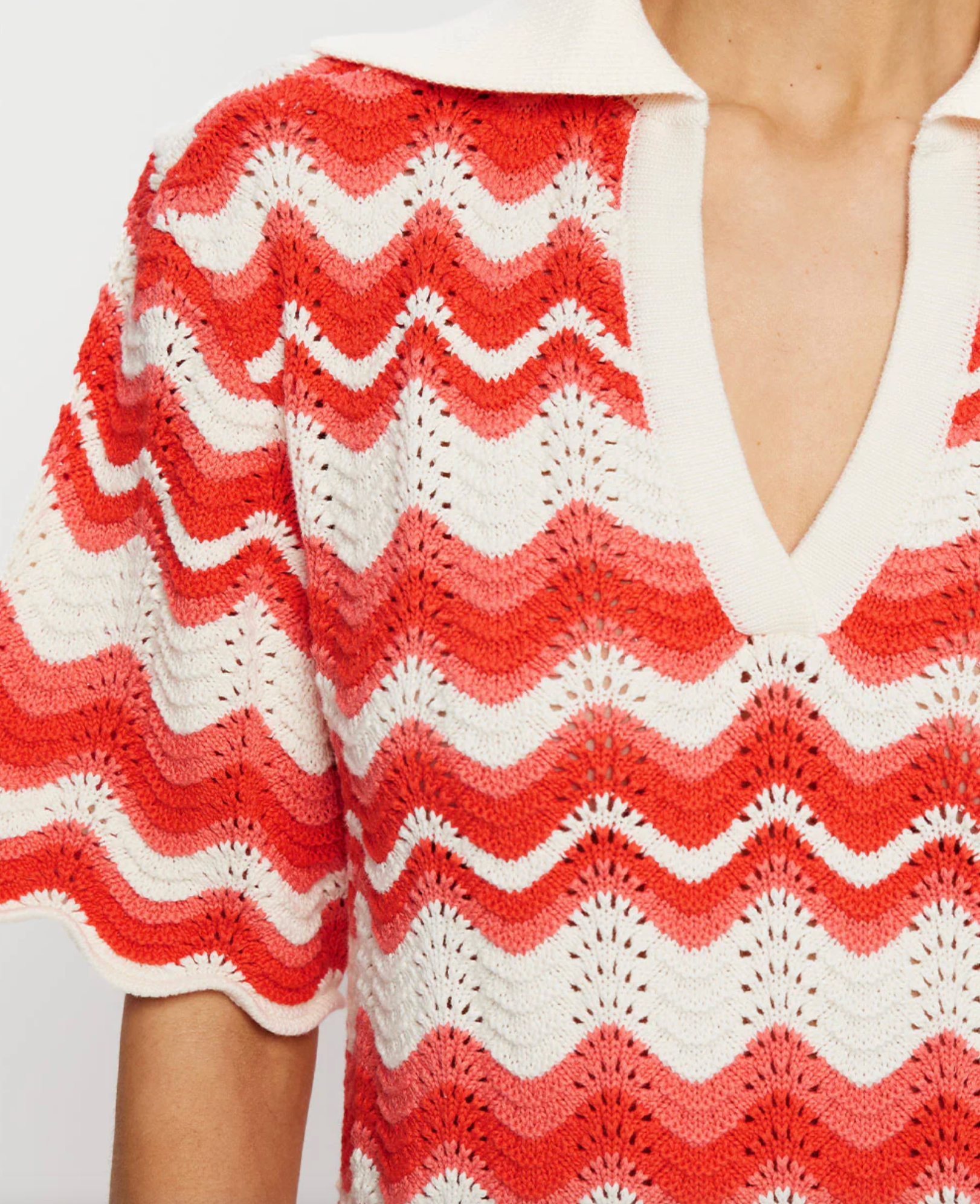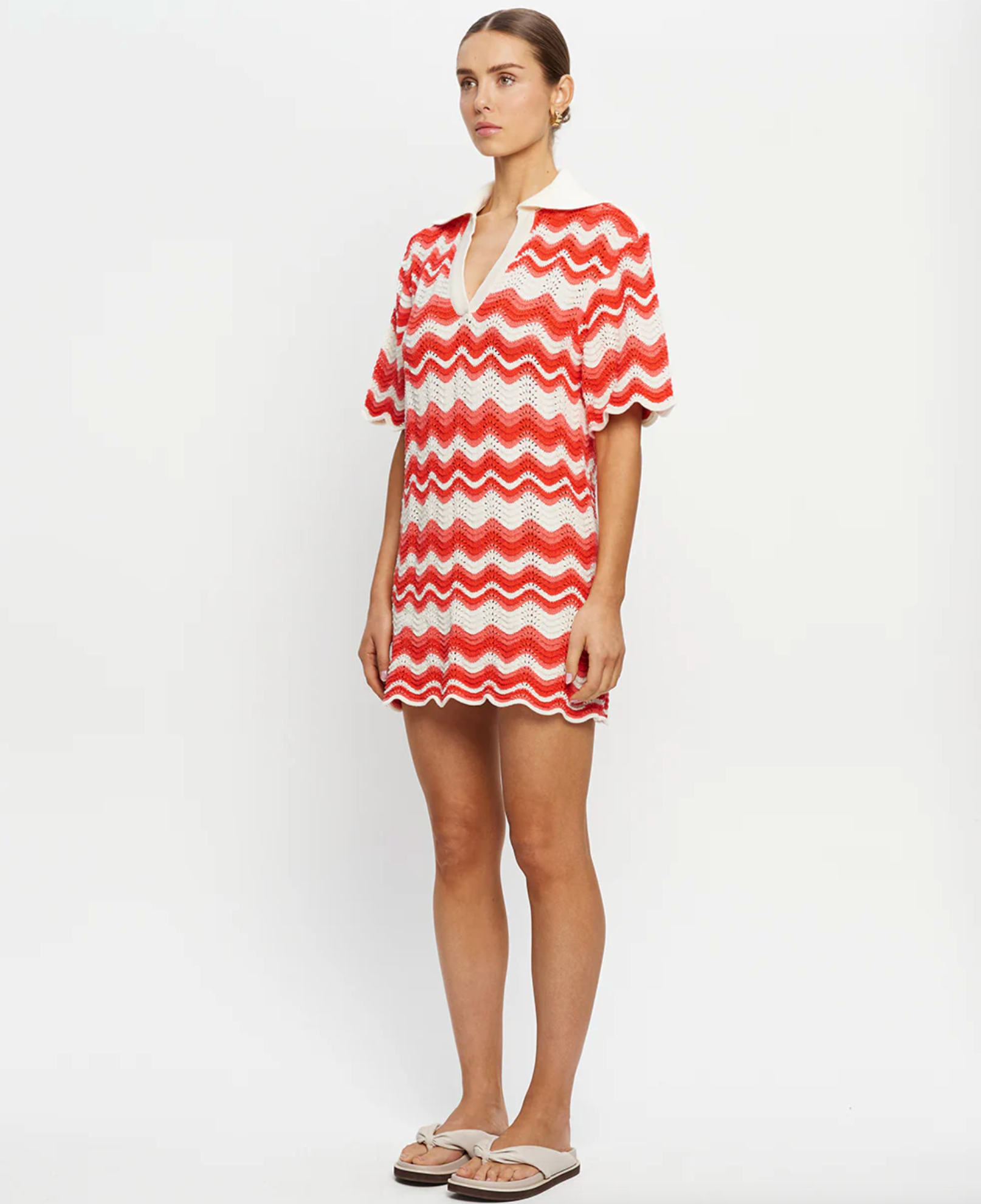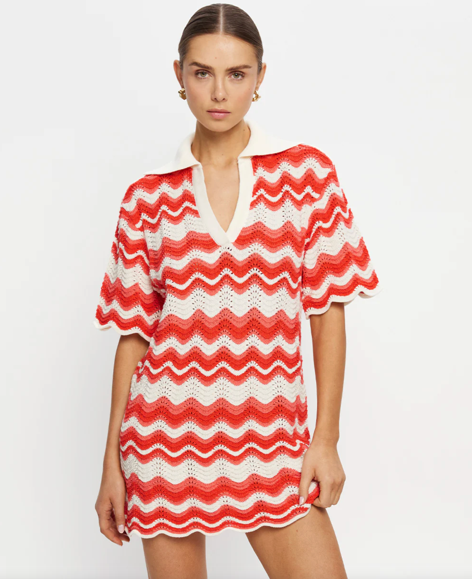 The Leighton Mini Dress in coral is crafted from an intricate wave-knit stitch in a relaxed silhouette, featuring a ribbed collar and scalloped edging at the hem and sleeves. Designed to feel lightweight and effortless, it’s a modern knit made for warm-weather styling. Pair with sandals for relaxed daytime plans and coastal escapes.