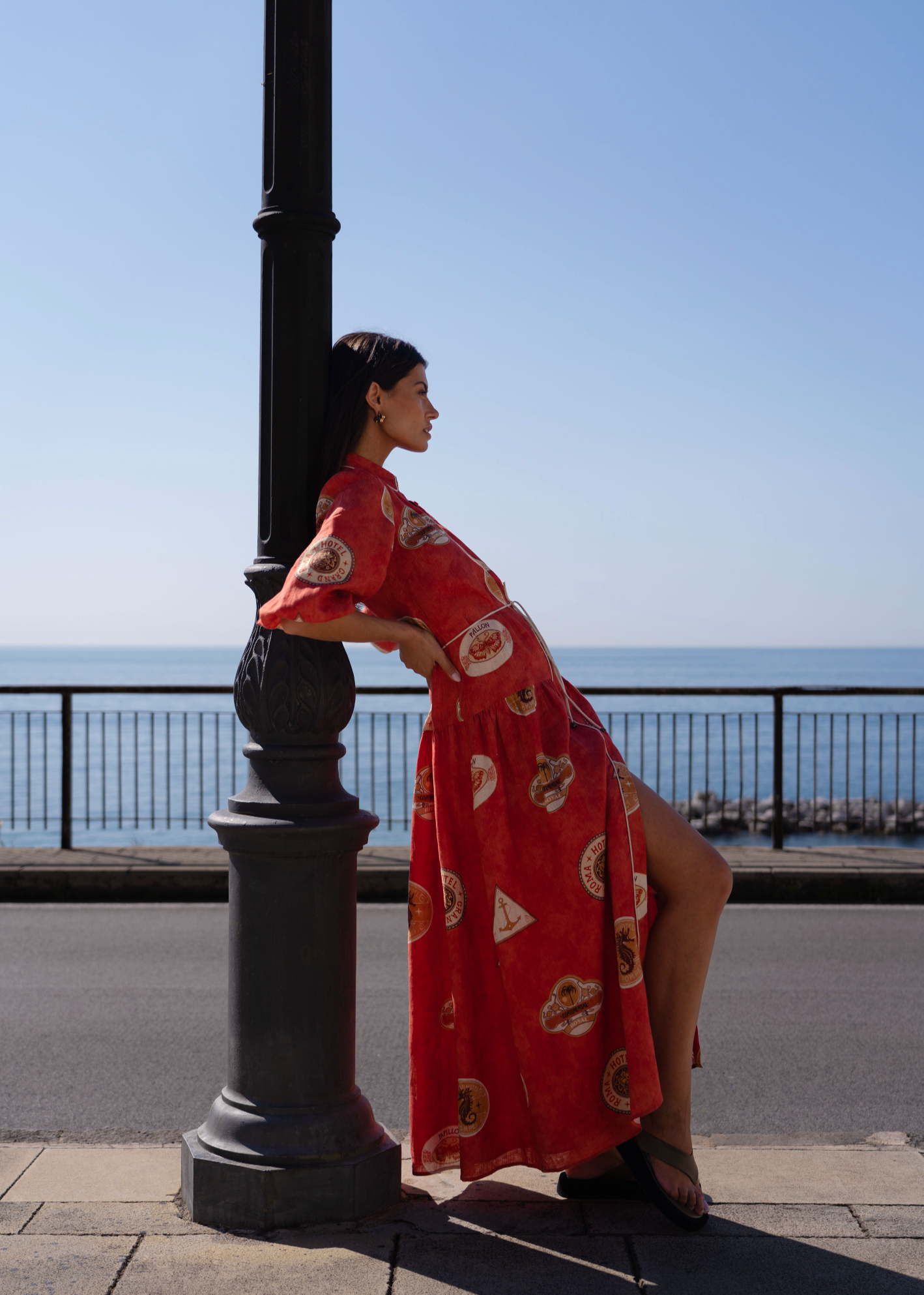 Vacanza is vintage motifs set against a rich, warm red base. The Vacanza Maxi Dress features a slight blouson sleeve, button down front, complete with a removable braided belt.