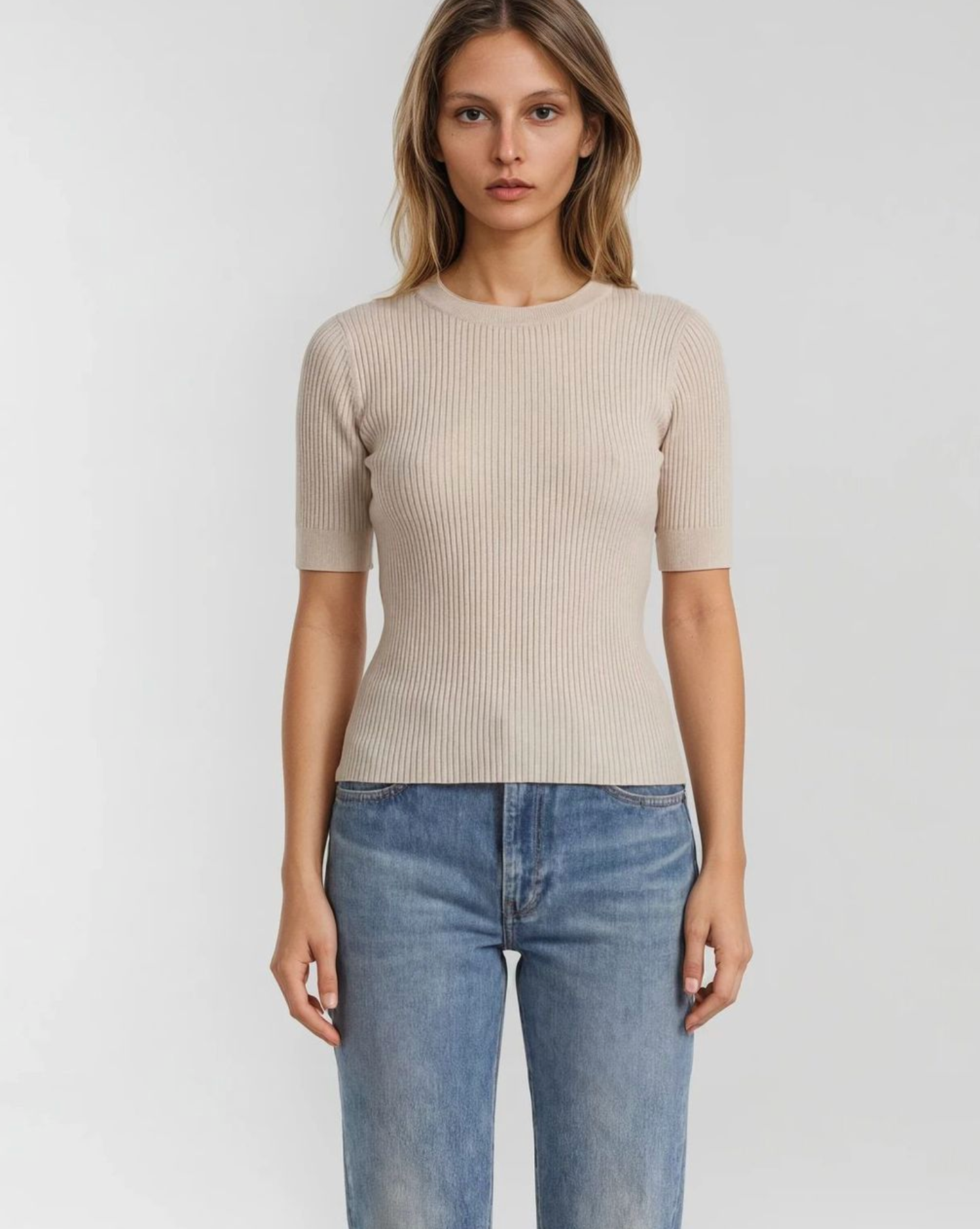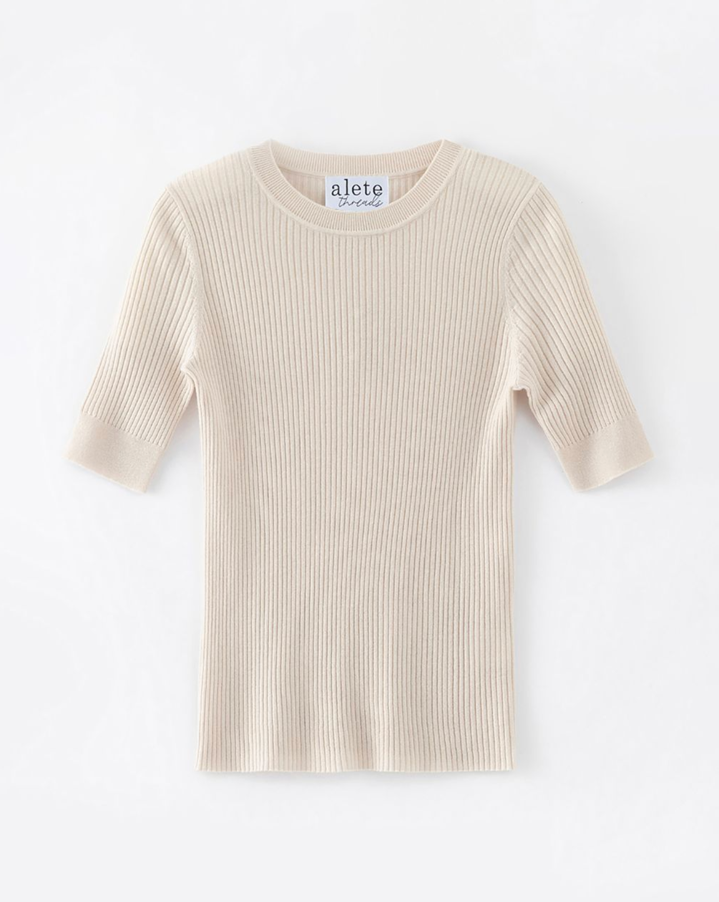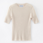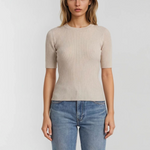 Crew Neck, short sleeves Ribbed texture with subtle structure 90% Merino Wool, 10% Cashmere Hand-Wash or Machine Wash COLD Forever your everyday essential